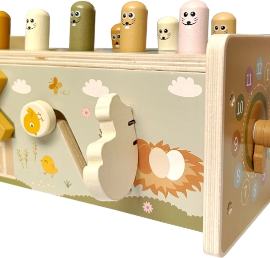 Тази богато оборудвана дървена мултифункционална играчка впечатлява децата с разнообразни възможности за игра и същевременно ненатрапчиво ги насочва към развитие на важни умения. Децата могат да чукат веселите къртици с дървено чукче, да ловят магнитни рибки, да въртят зъбни колела, да пробват стрелките на часовника и да откриват други механични елементи, които подпомагат разбирането на причината и следствието.