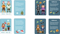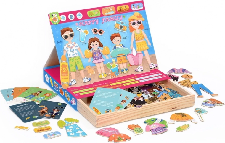 Магнитното обличане „Семейство“ е креативен комплект, в който децата проектират дрехи за мама, татко, дъщеря и син. Благодарение на богатия избор от облекла и аксесоари могат да създават тоалети за лято, есен, зима и пролет и да изпълняват забавни задачи от тематичните картончета. Практичната дървена магнитна кутия с обръщаема дъска служи като игрална повърхност и като кутия за съхранение, така че играта е винаги готова да тръгне с вас.