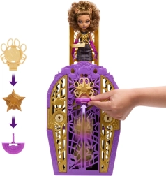 Тръгнете по следите на Clawdeen Wolf в света на Холидъх! С ключа с лупа разкрийте символите на картата, отключете украсения шкаф и открийте тематични аксесоари със същите символи. Намерените три части сглобете в талисман, закрепете го в основата на шкафа и го плъзнете нагоре – ще разкриете куклата Clawdeen в ослепителна визия. Този магичен момент можете да повтаряте отново и отново.