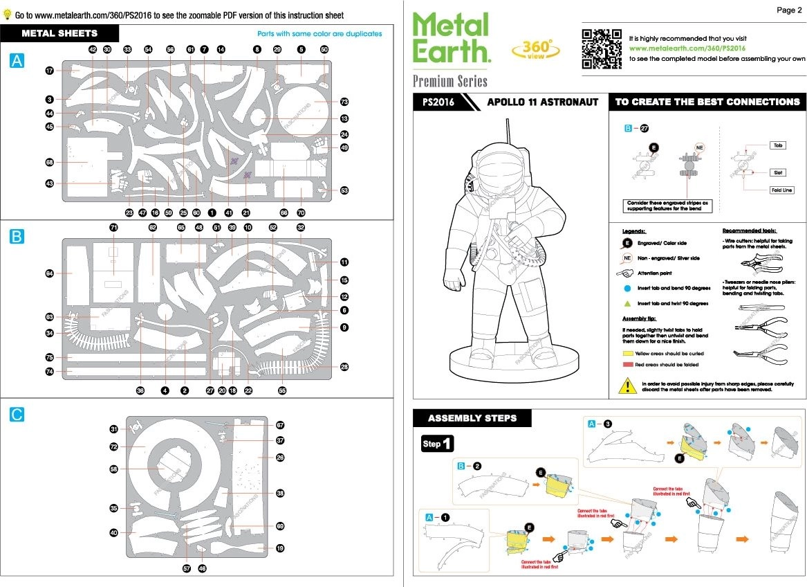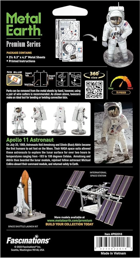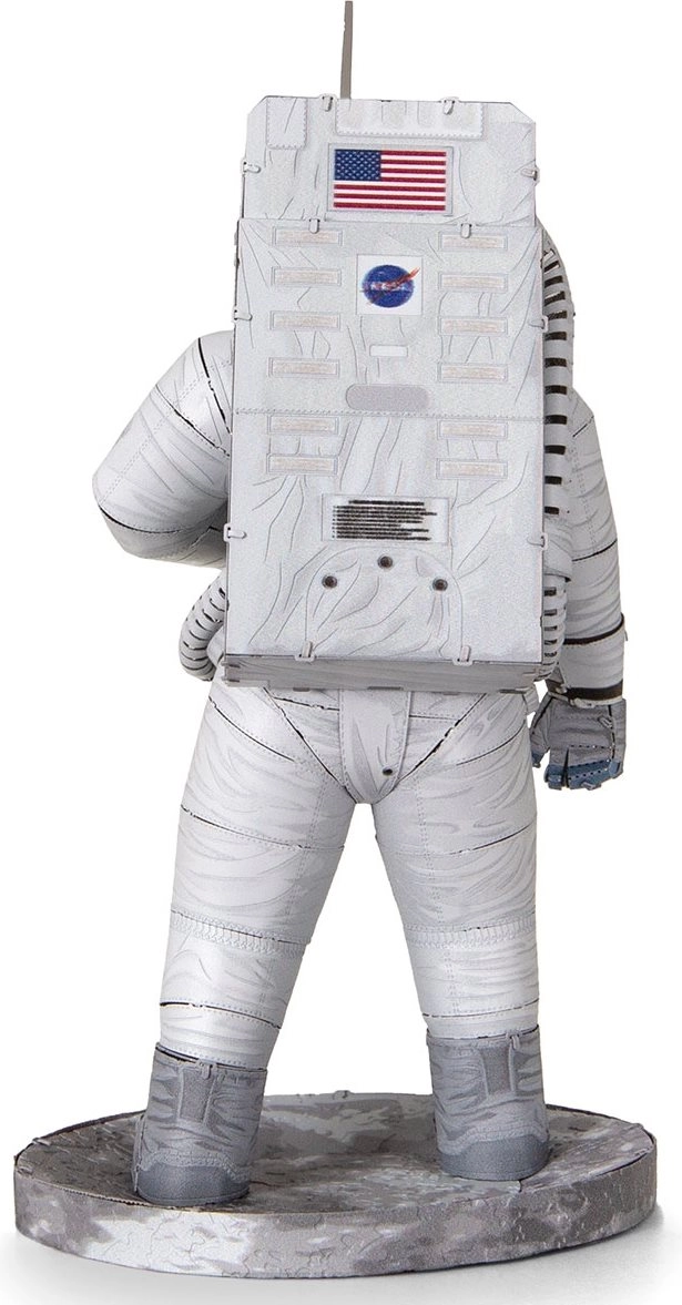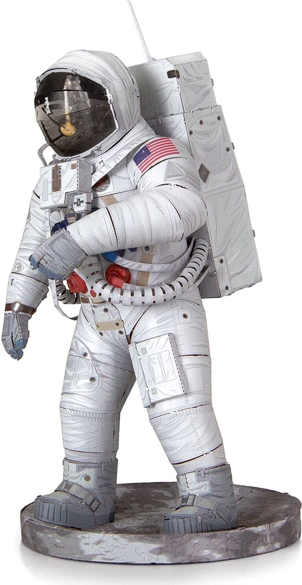 Сглобете емблематичния астронавт от мисията Apollo 11 от прецизно лазерно гравирани стоманени пластини. 3D пъзелът METAL EARTH предлага детайлен метален модел, който ще изпита търпението и сръчността ви и ще ви възнагради с впечатляваща декорация с автентичен вид.