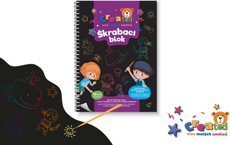 Този скрач тефтер предлага на деца и възрастни забавна форма на творчество. Под тъмния слой се крие цветна основа, която се разкрива с леко надраскване. Създавайте рисунки, надписи, пожелания или малки плакати – въображението няма граници.