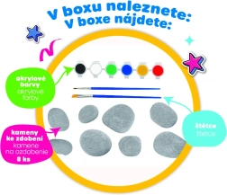 Открийте креативен комплект за рисуване върху камъчета, който позволява на децата да превърнат обикновени камъчета в оригинални художествени творби. Комплектът съдържа всичко необходимо за незабавно създаване – четки, бои и камъчета, благодарение на които се развиват фантазията, фината моторика и творчеството. Подходящо за деца от 4 години.