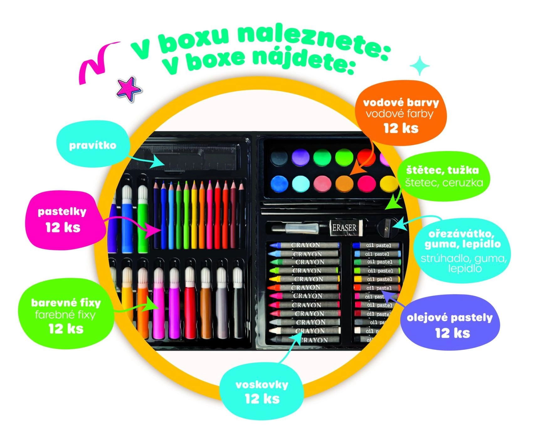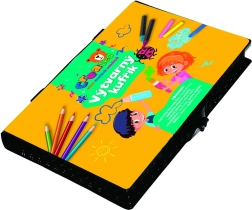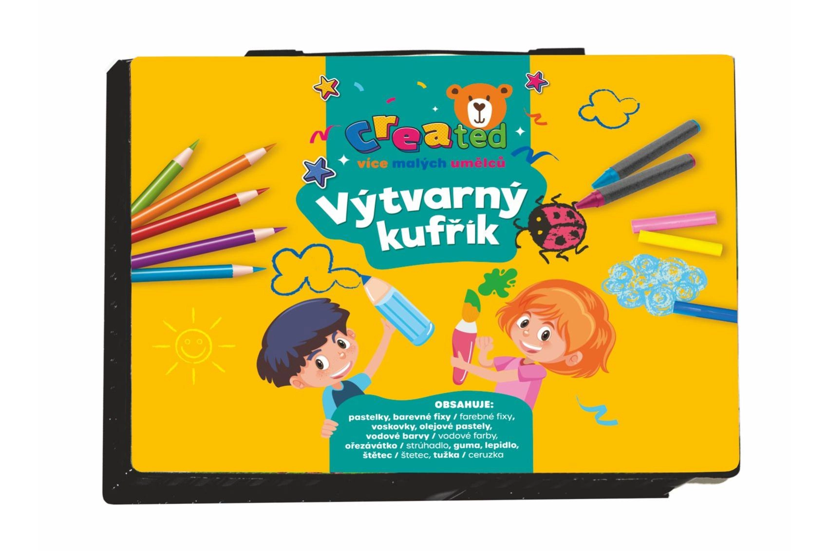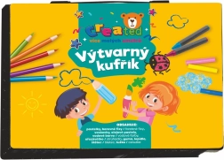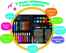 Практичен креативен комплект за малки артисти в издръжливо пластмасово куфарче, който предлага всичко необходимо за рисуване и скициране. Идеален за дома, детската градина и пътуване. Съдържа пъстър избор от материали, които развиват детското въображение и фината моторика, включително цветни моливи, флумастери и акварелни бои.