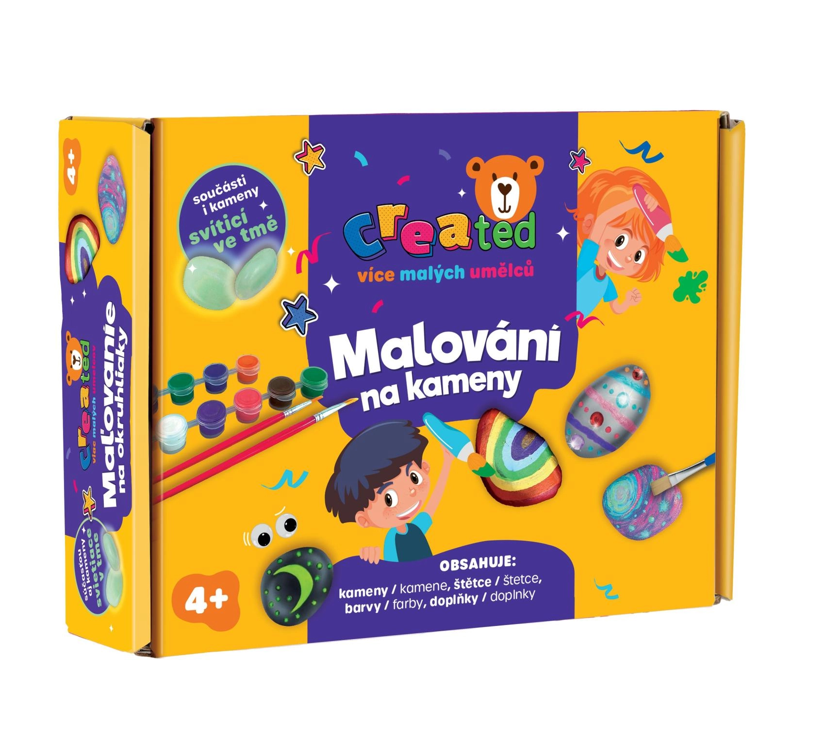 Открийте забавен креативен комплект, с който ще превърнете обикновени камъчета в малки художествени съкровища – някои от тях дори светят в тъмното! Идеален за деца от 4 години, комплектът съдържа бои, четки и аксесоари в практична кутия, готов за незабавно творчество и носи много забавление и креативност.