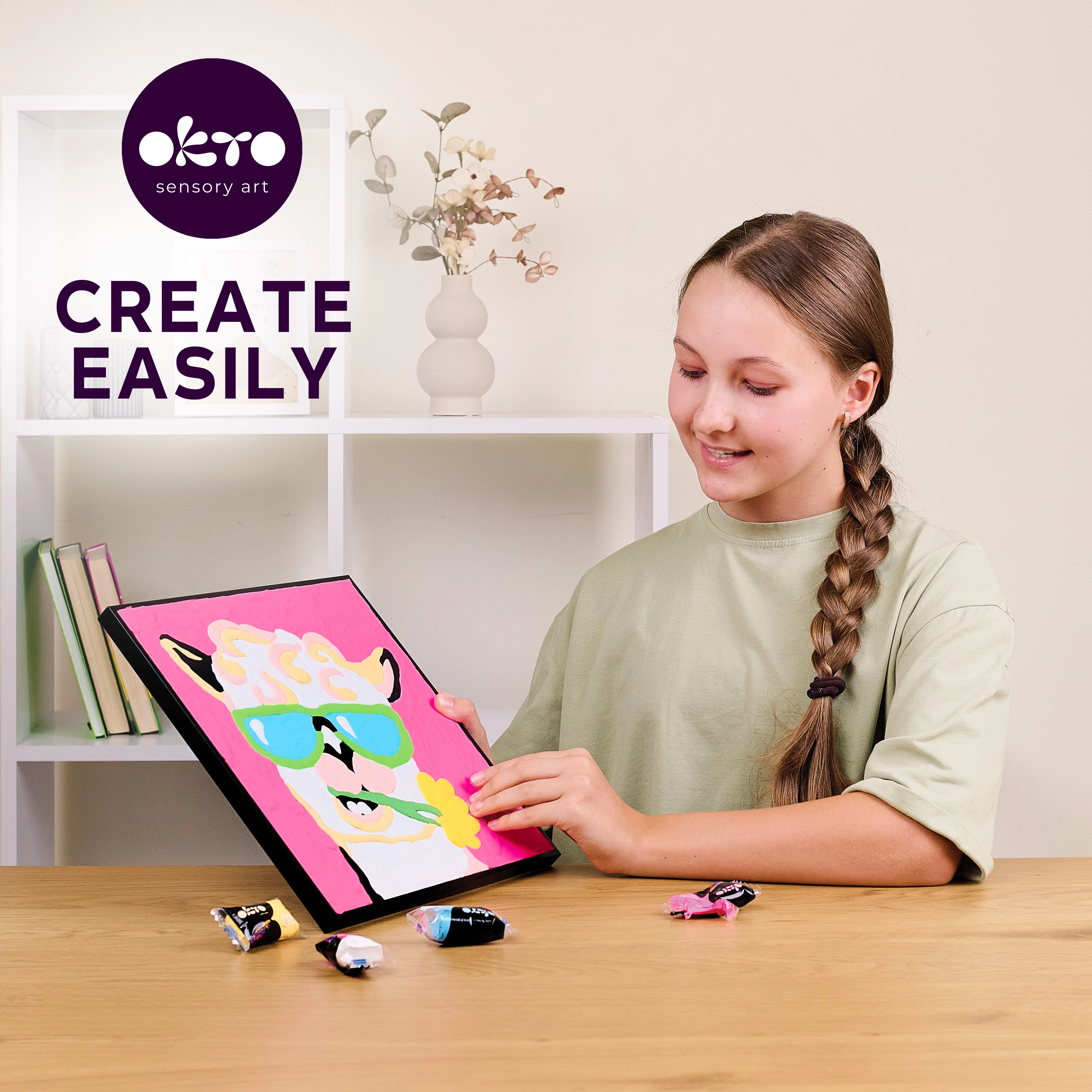 Открийте забавен начин за творчество с пластична моделираща маса, която придава на картината уникална текстура. Благодарение на номерираните зони лесно следвате стъпка по стъпка и постигате отличен резултат дори без предишен опит. Мотивът на сладката лама е подходящ за детска стая или като оригинален подарък.