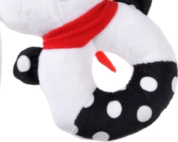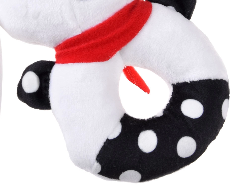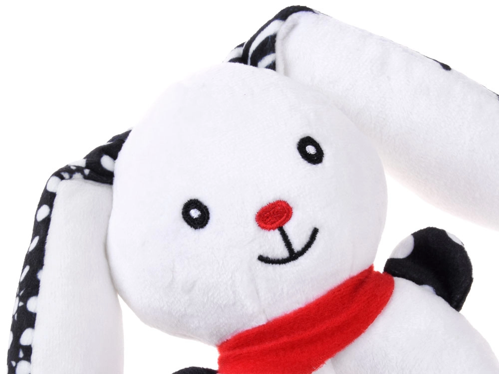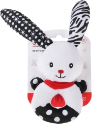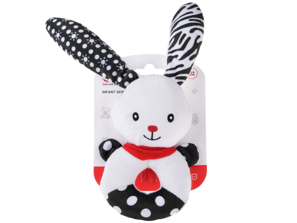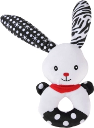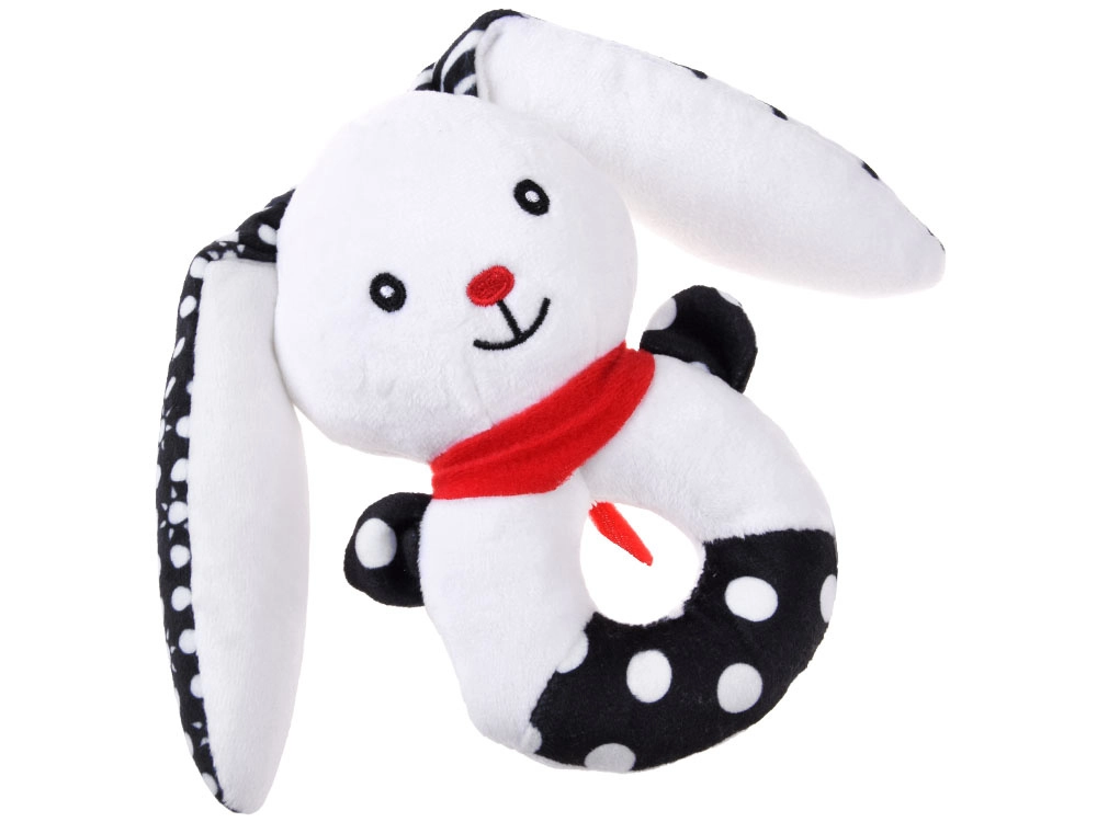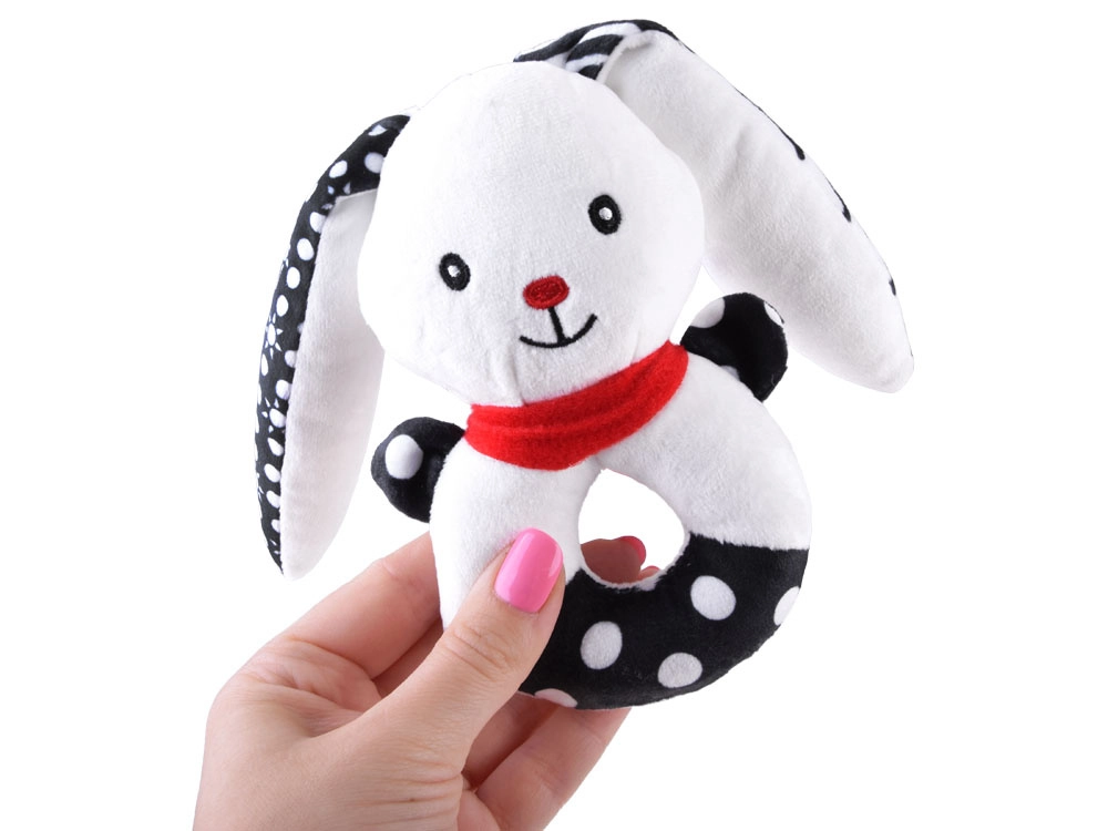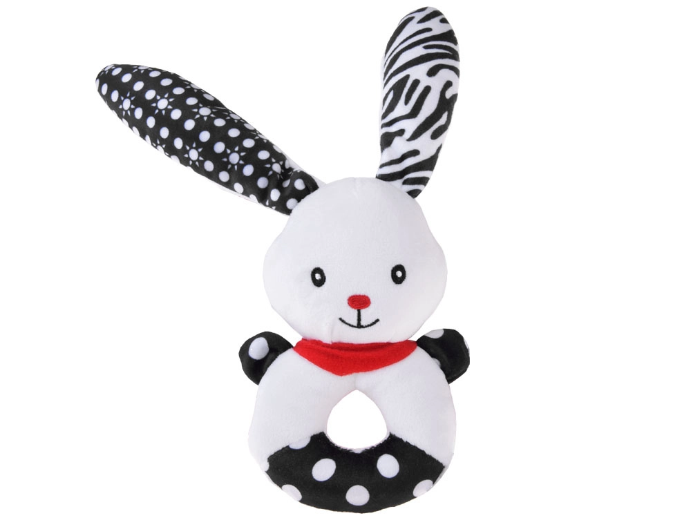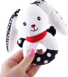 Тази мека контрастна играчка комбинира функциите на дрънкалка, свирка и първа плюшена играчка за гушкане. Кръглата, лесна за хващане форма с отвор в средата, изпъкнала главичка и дълги ушички помага за трениране на фината моторика и координацията ръка–око. Контрастните черно-бели мотиви са отлично видими за бебетата и привличат вниманието им.