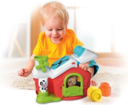 Децата ще се забавляват и с механичните елементи: коминът има функция „натисни и излез“, при която кубчето се плъзга навън от страничен отвор, а ветропоказателят се завърта още при леко докосване. Сензорните текстури по повърхността подпомагат развитието на осезанието, докато сортирането и манипулирането на кубчетата развиват координацията око–ръка и фината моторика. Тематичната фермерска среда с фигурки насърчава креативната игра и разказването на собствени истории.