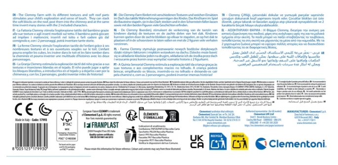 Тази интерактивна ферма от серията Clemmy предлага безопасна и стимулираща игра за малчугани. Вътре ще откриете множество меки, лесни за хващане кубчета, които могат да се поставят през прозорците и през покрива. Едната част на покрива има мека вложка за вмъкване, а другата се отваря за лесно изваждане на кубчетата.