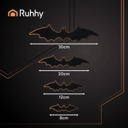 Стилна декорация за Хелоуин, тематични партита и фотокътчета. Комплектът съдържа прилепи в 4 размера, които лесно комбинирате в рояк или ефект на „излитане“. Благодарение на ниското тегло и приложената лента монтажът е бърз и щадящ към повърхностите.