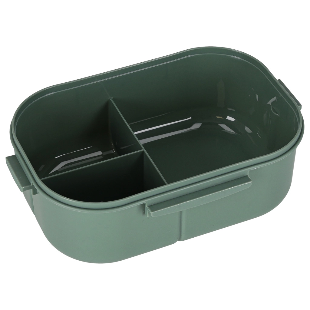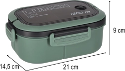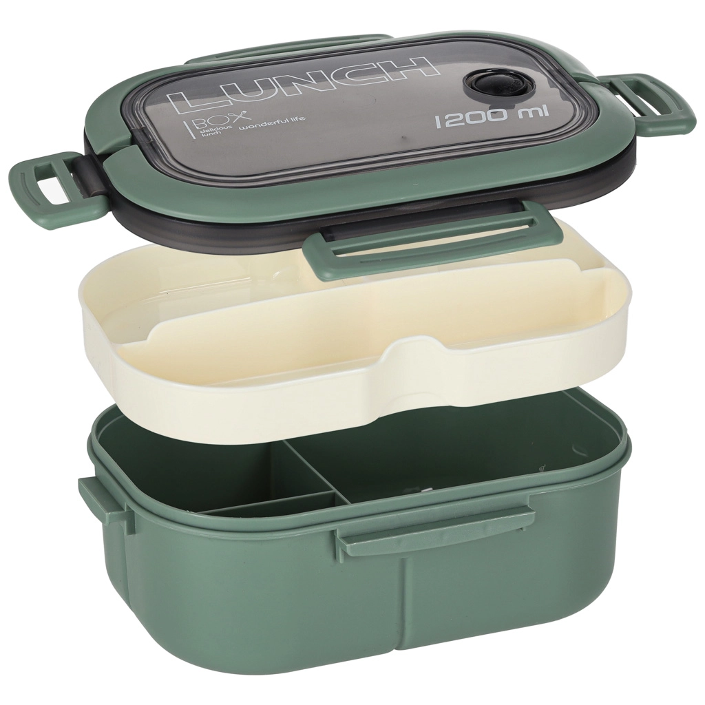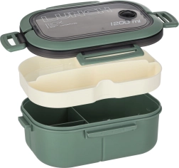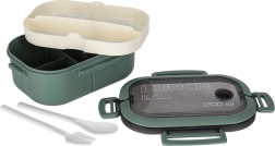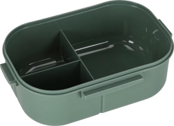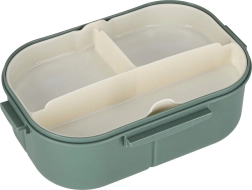Стилна и функционална кутия за обяд в зелени нюанси с капацитет 1200 ml и добре обмислено разпределение за удобно пренасяне на целия обяд. Благодарение на подвижното ниво с 3 отделения лесно държите порциите разделени без смесване на вкусовете.
