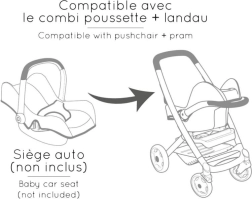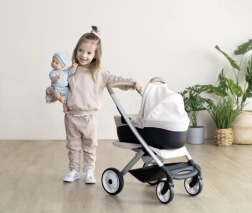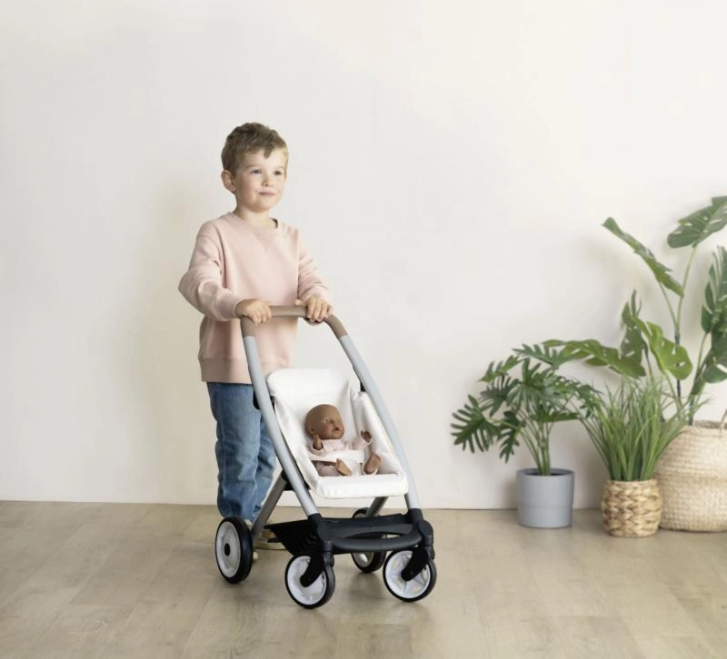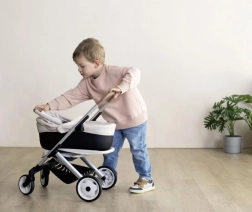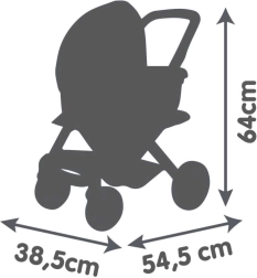 Стилна количка за кукли 3 в 1 с сменяемо кошче и възможност за бърза трансформация в спортна количка. Предлага въртящи се предни колела за лесно маневриране, тих ход благодарение на шумоизолиращия слой на колелата и ергономична дръжка на височина 65 см. Калъфите от издръжлива пластмасова тъкан се почистват лесно с влажна кърпа. Подходяща за кукли до 42 см.