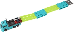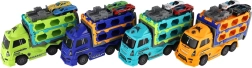 Този издръжлив пластмасов камион служи като превозвач за малки състезателни коли и предлага на децата много динамично забавление. Благодарение на инерцията се засилва след дръпване, което го прави идеален за игра върху килим и гладки повърхности.