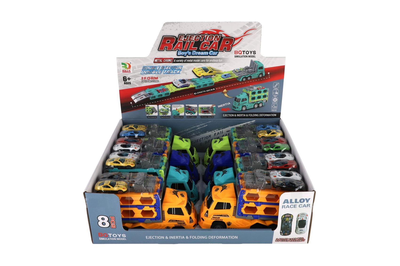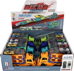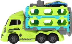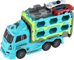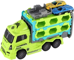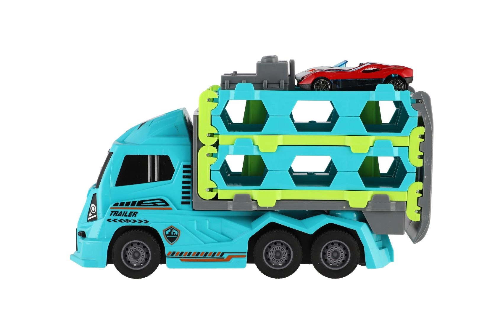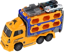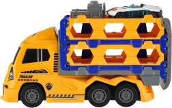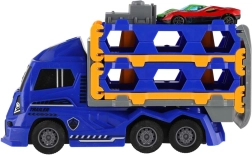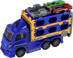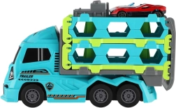 Подарете на децата динамично каране с този пластмасов камион – превозвач на състезателни коли. В комплекта има 2 спортни колички, камионът е с задвижване по инерция за бързо движение и дължина 22 см. Идеален за игра у дома и навън, развива фантазията и фини моторни умения на малките шофьори.