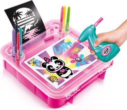 Открий света на рисуването с аерограф и създай оригинални дизайни навсякъде! Този комплект включва всичко необходимо за лесно разпръскване на цветове за деца от 6 години: 1 аерограф, 8 цветни флумастера, 10 шаблона и 10 листа за творчество. Компактната опаковка е идеална за път и подпомага креативността и фината моторика.