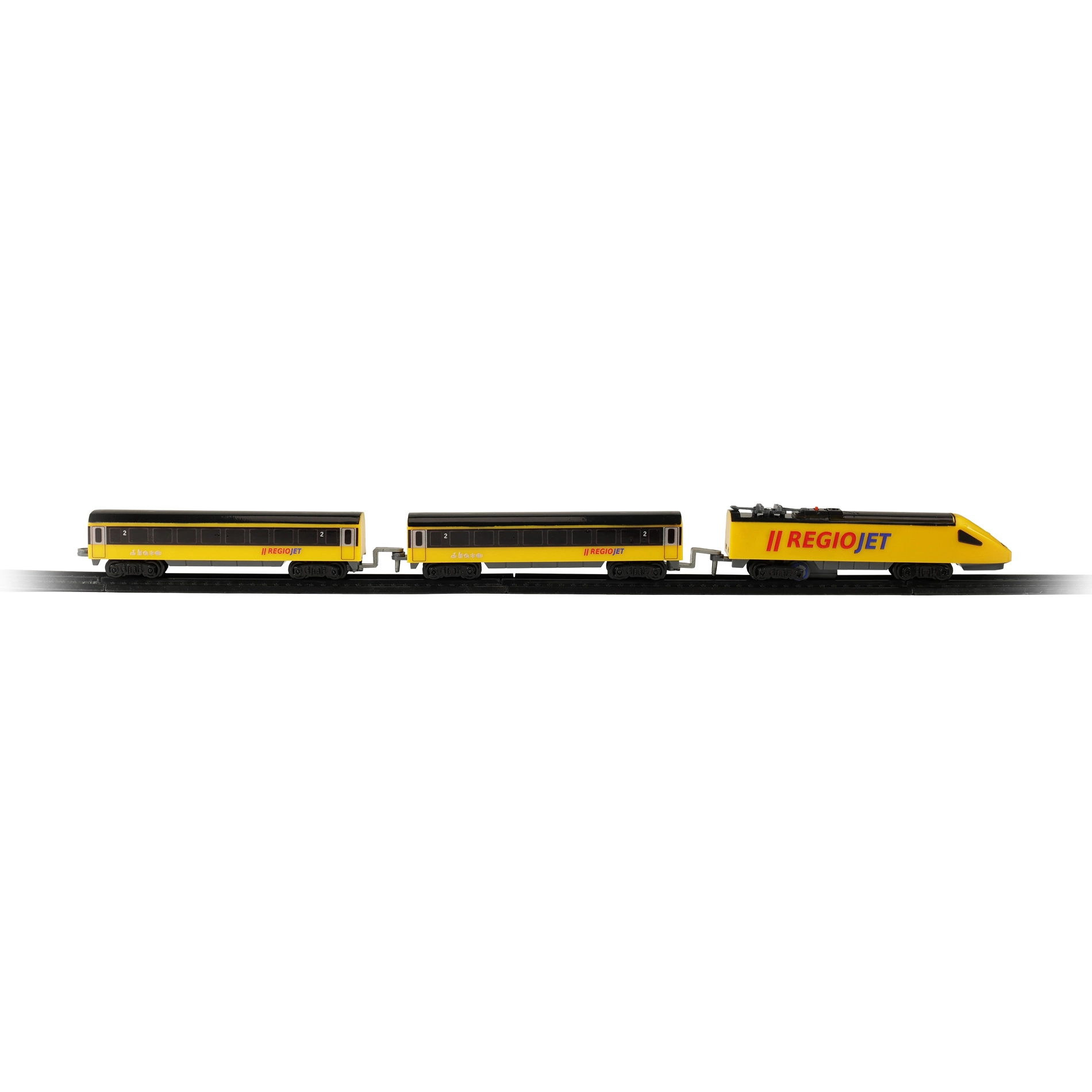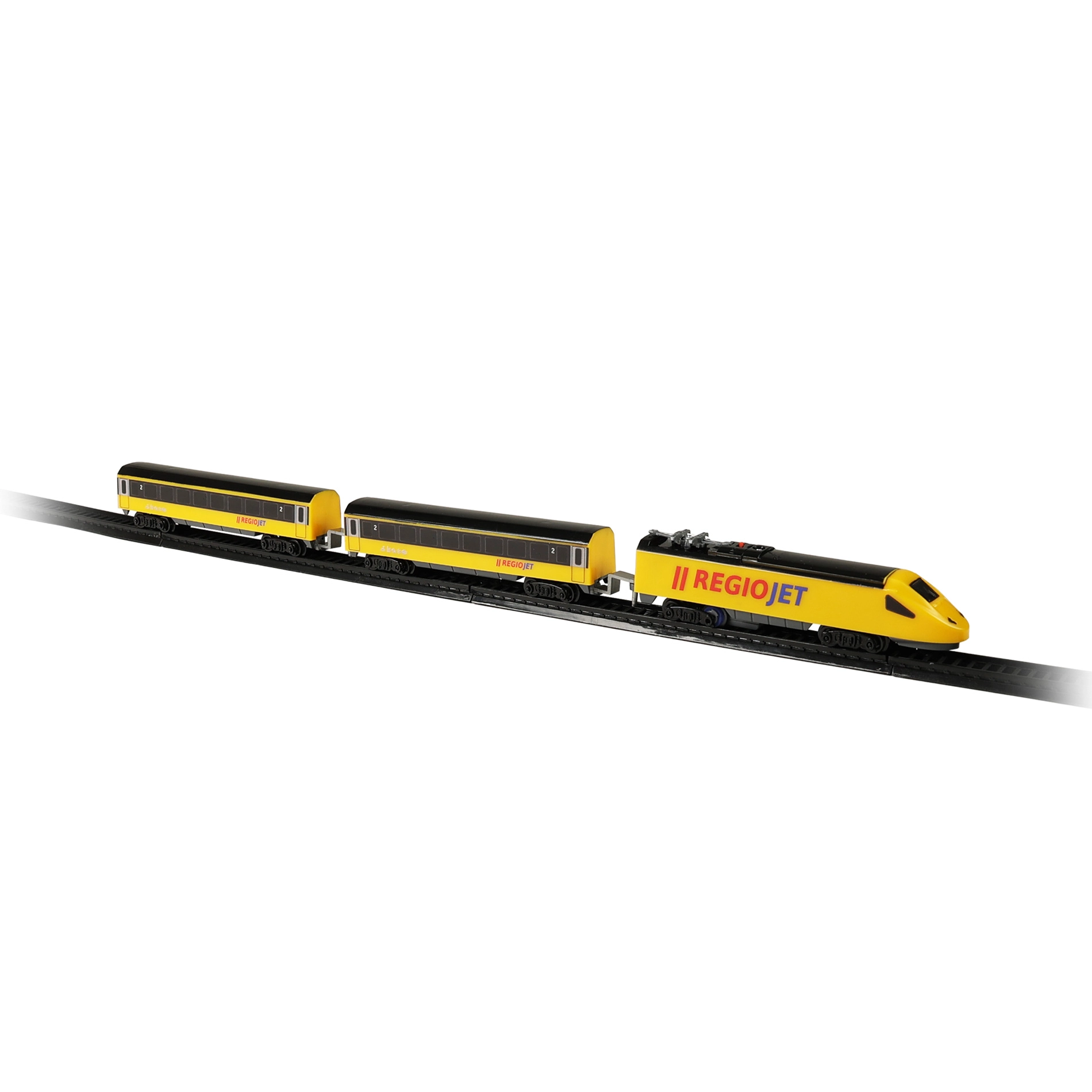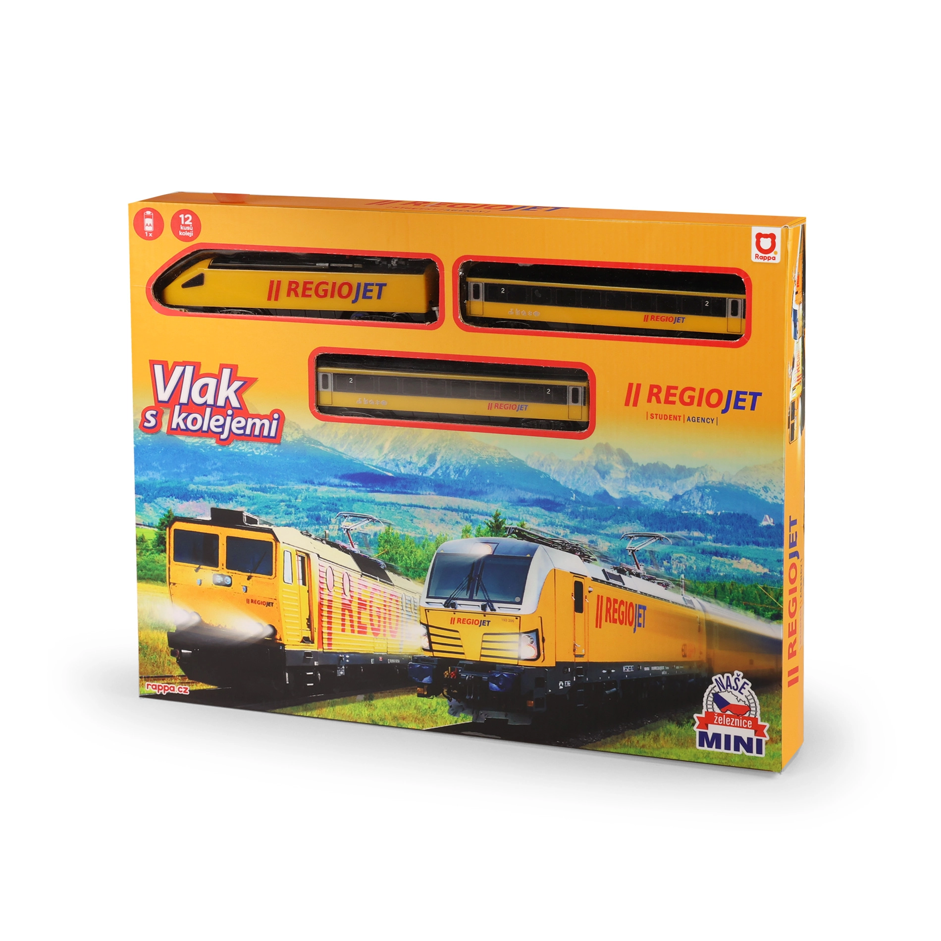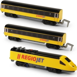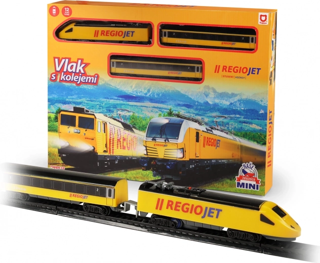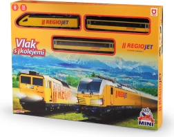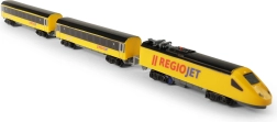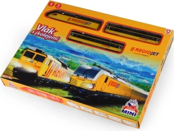 Открийте забавлението с влакчета с компактния сет RegioJet MINI. Жълтият локомотив с два вагона се движи по модулния коловоз, който лесно сглобявате от 8 извити и 4 прави елемента. Благодарение на практичния превключвател на покрива на локомотива управлението е изключително лесно, така че децата могат бързо да започнат играта.