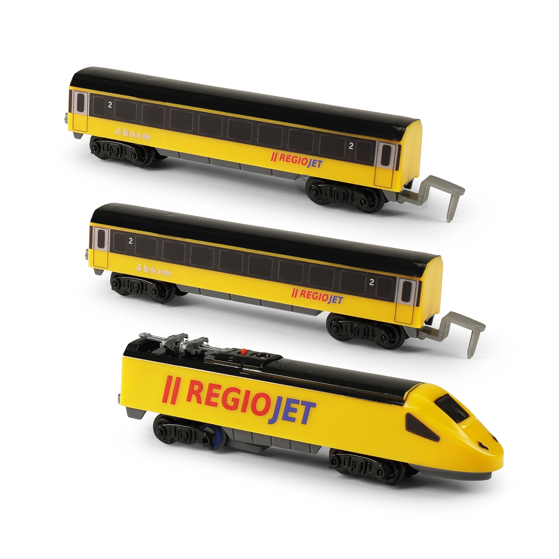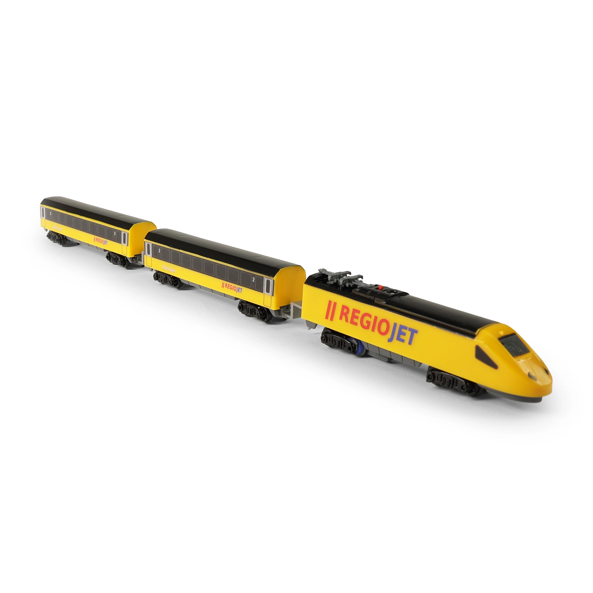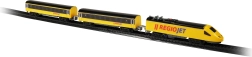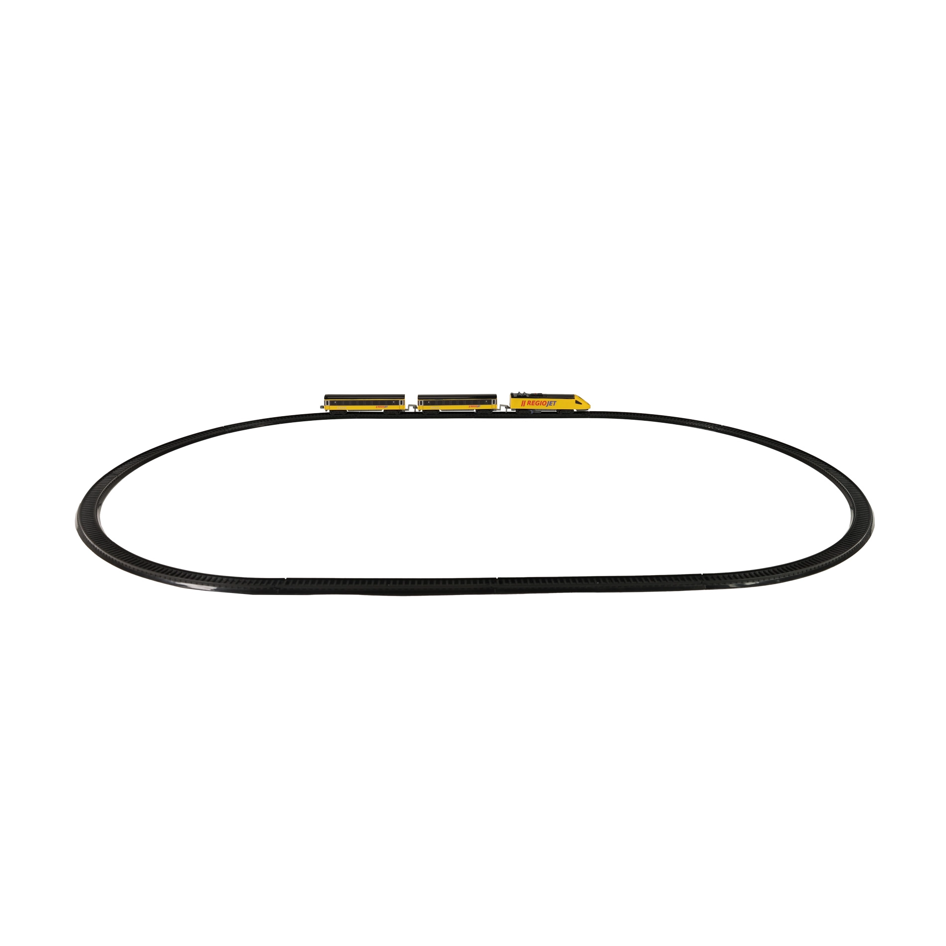 Открийте забавлението с влакчета с компактния сет RegioJet MINI. Жълтият локомотив с два вагона се движи по модулния коловоз, който лесно сглобявате от 8 извити и 4 прави елемента. Благодарение на практичния превключвател на покрива на локомотива управлението е изключително лесно, така че децата могат бързо да започнат играта.