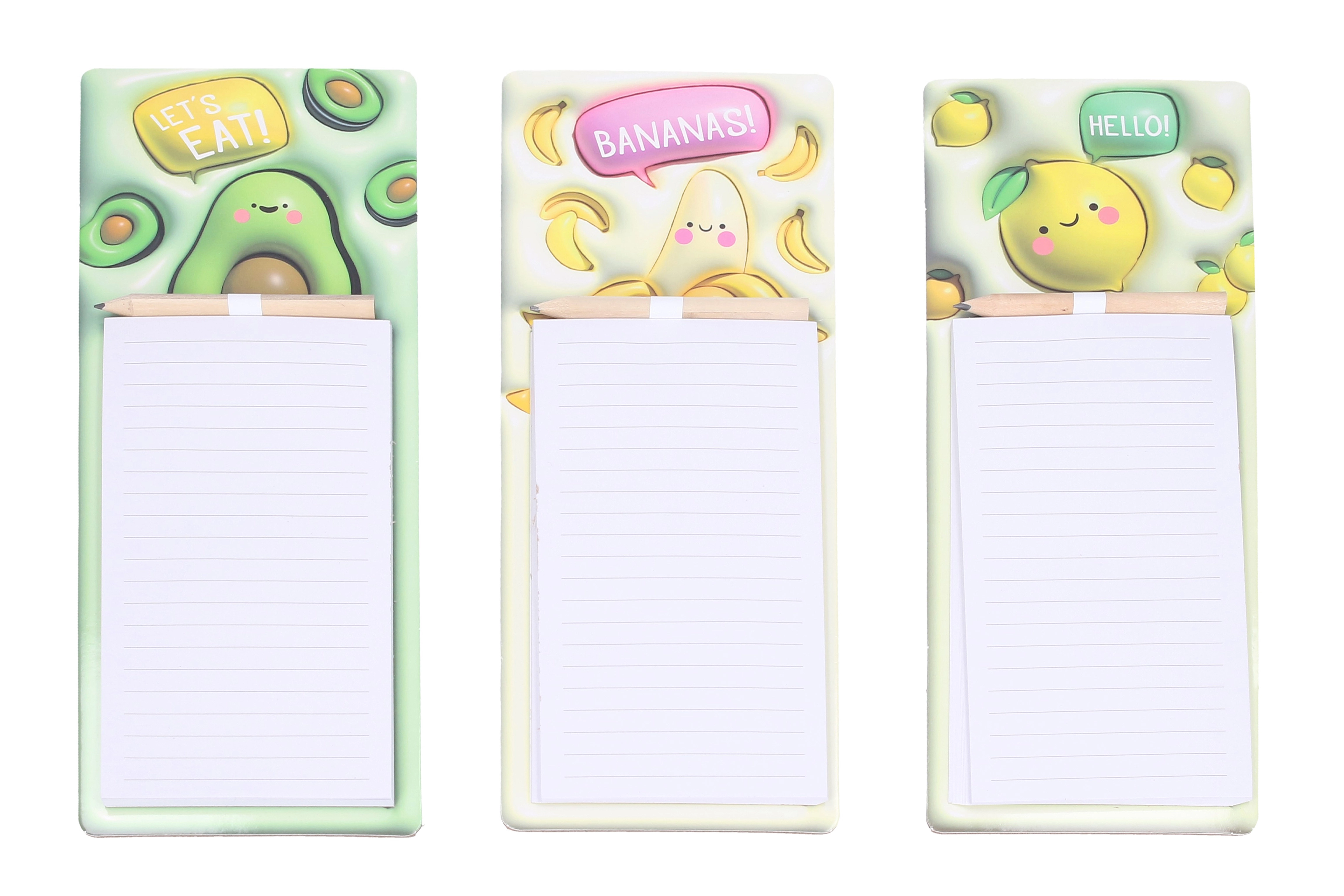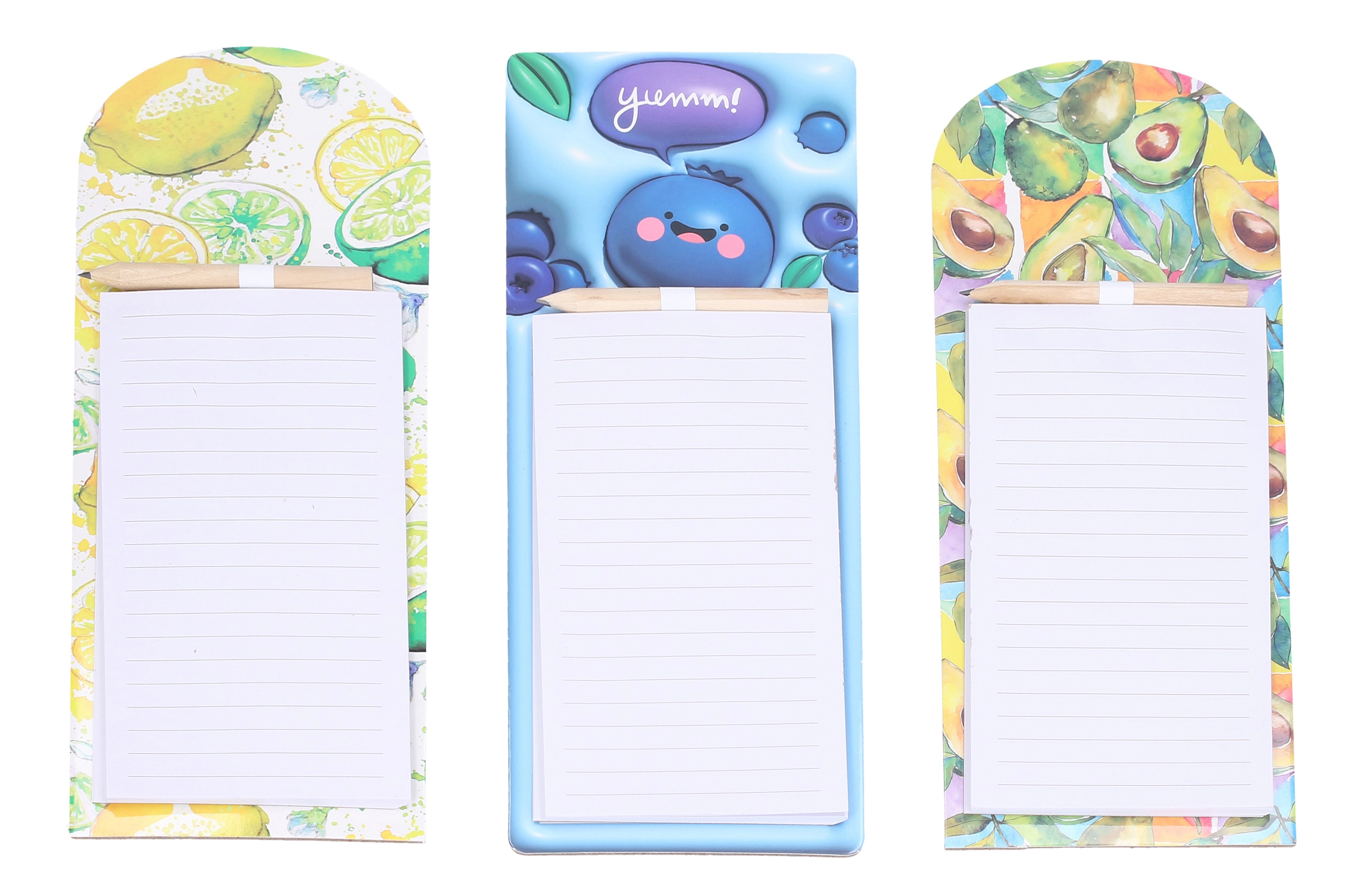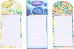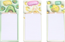 Подредете покупките и ежедневните задачи с магнитните тефтери с весели плодови мотиви. Благодарение на здравия магнит лесно ги закрепвате на хладилник или други метални повърхности, за да са винаги под ръка. В комплекта има практичен молив, закрепен в горната част, за да пишете по всяко време без търсене.