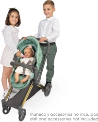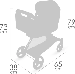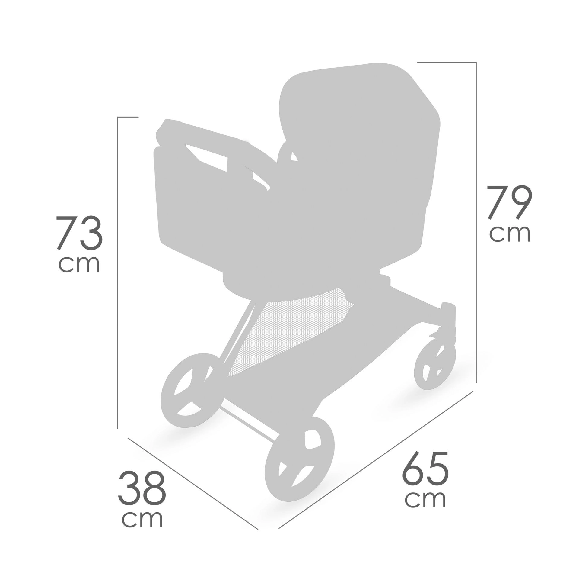 Практичните решения се допълват от регулируем сенник, триточков колан за безопасно закрепване на куклата и просторна долна кошница. Количката се сгъва бързо за съхранение и транспорт с автомобил. В комплекта е включена елегантна сваляема чанта в цветовете на колекцията.