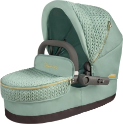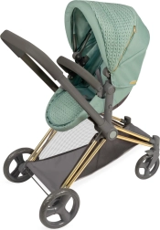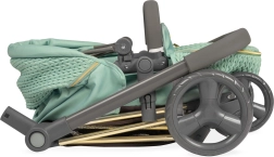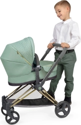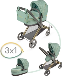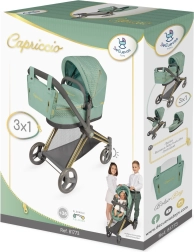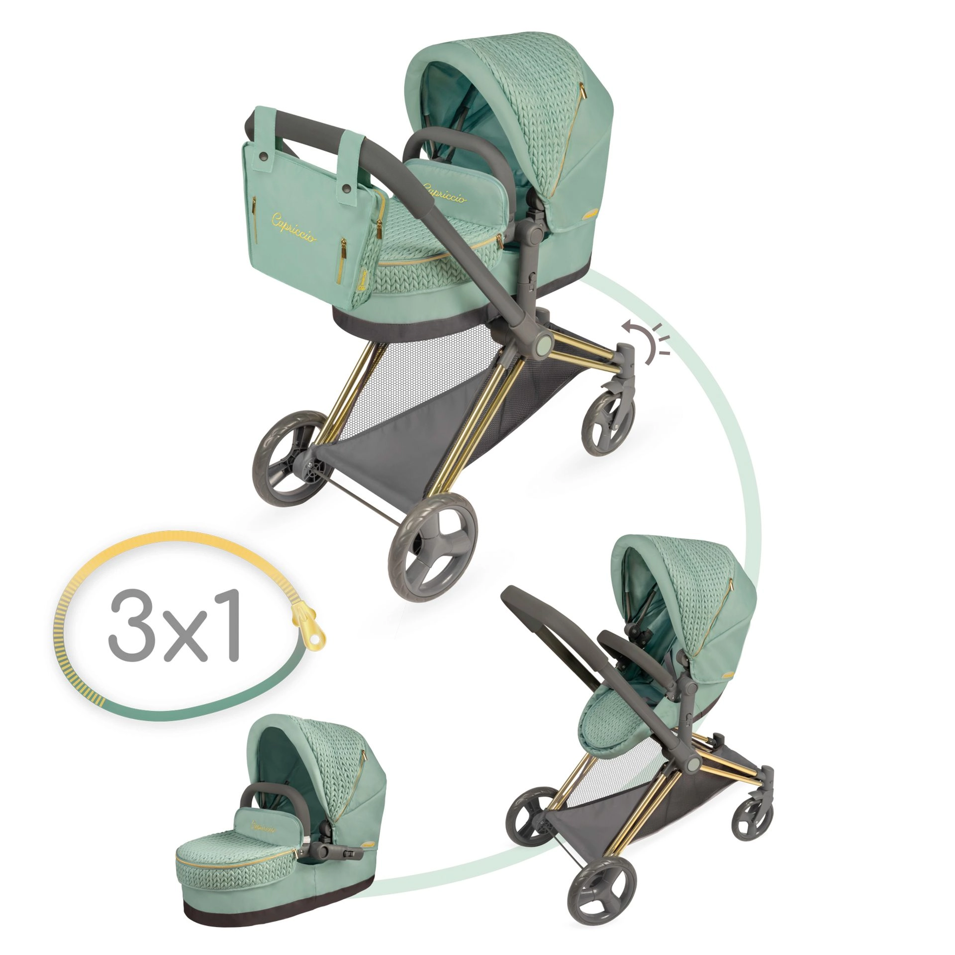 Елегантна детска количка за кукли 3 в 1 от колекция CAPRICCIO в модерeн ментово зелен цвят предлага дълбок кош, спортна седалка и преносима ваница. Има регулируем сенник, въртящи се предни колела за лесно маневриране, багажна кошница и сваляема чанта със златни ципове. Благодарение на сгъваемата конструкция не заема място и е идеална за деца от 3 години.