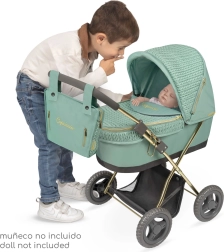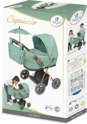 Стилна количка за кукли от колекция Capriccio 2025 впечатлява с модерния ментово зелен дизайн, ниско тегло и лесна маневреност. Предлага сгъваема конструкция, слънчобран, сваляема чанта със златни ципове, мека матрак и практична кошница за съхранение – идеална за по-малки деца от 3 години.