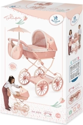 Елегантната сгъваема количка за кукли от колекция TULIPE впечатлява с винтидж визия, регулируема по височина дръжка 52–81 cm и богато оборудване, включително чанта във формата на лале и сгъваем чадър. Здравата метална рамка, пружини за люлеене и просторна долна кошница осигуряват удобно играене и лесна маневреност.