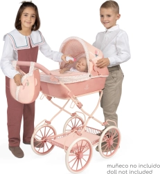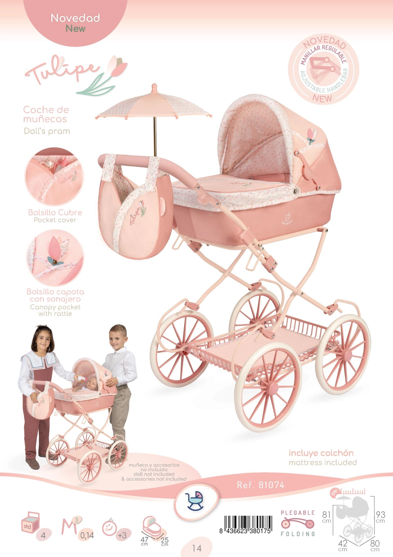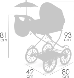 В комплекта са включени стилна чанта във форма на лале, сгъваем чадър и мек матрак за куклата. Налични са още джоб на сенника, покривало за коша с копчета и просторна кошница под шасито. Големите спицови колела и пружините осигуряват плавно люлеене и стабилно возене.