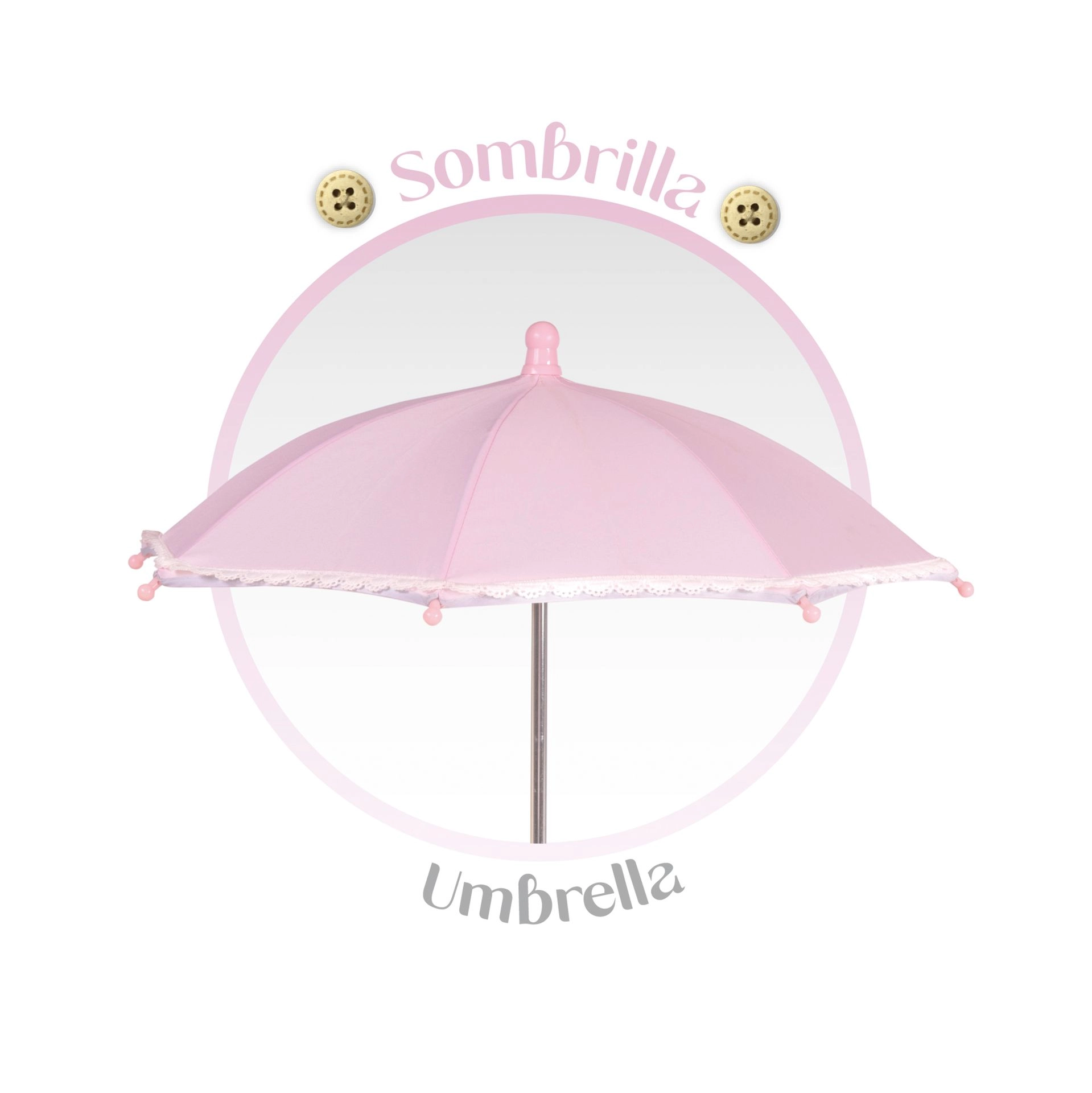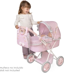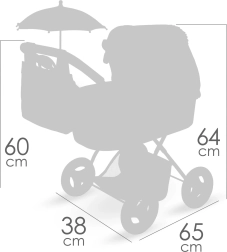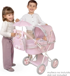 В комплекта има практичен слънчобран, подвижна чанта и покривало за кошчето с капси за стабилно фиксиране. Меката матраче и просторното кошче осигуряват комфорт за куклата, докато долната кошница предлага място за дреболии и аксесоари.