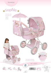 Открийте романтичната количка за кукли от колекция SOPHIE с нежни дантели и панделки. Светлорозовият цвят в комбинация със сиви и бели детайли изглежда приказно и подчертава испанския дизайн и прецизната изработка. Сгъваемият механизъм осигурява удобно съхранение и пренасяне, така че количката е готова за игри у дома и навън.