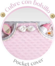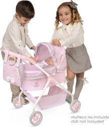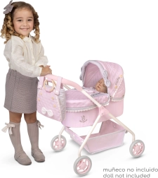 Практичното оборудване включва сваляема чанта за количката или за носене в ръка, покривало за кошчето с халки и джобчета, удобен матрак и долно място за съхранение за дребни вещи. Испанският дизайн и прецизната изработка осигуряват дълъг живот и радост от играта всеки ден.