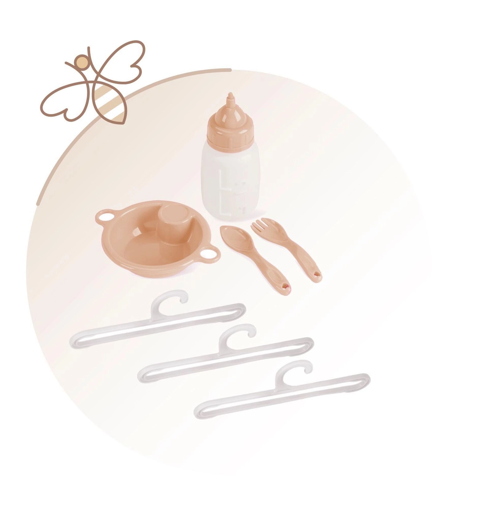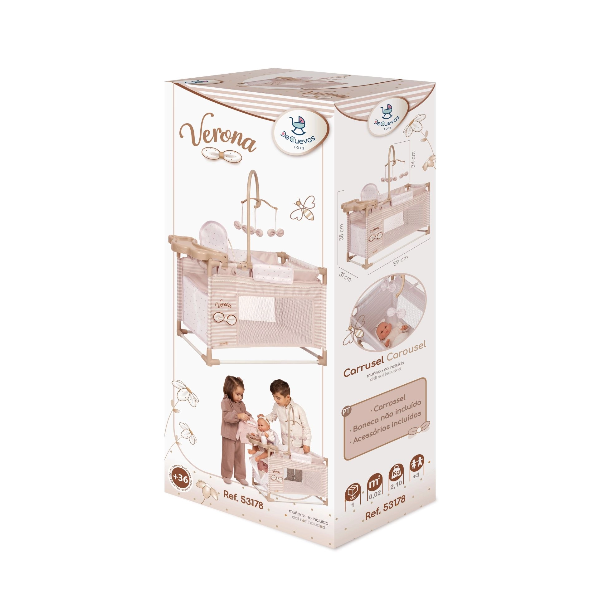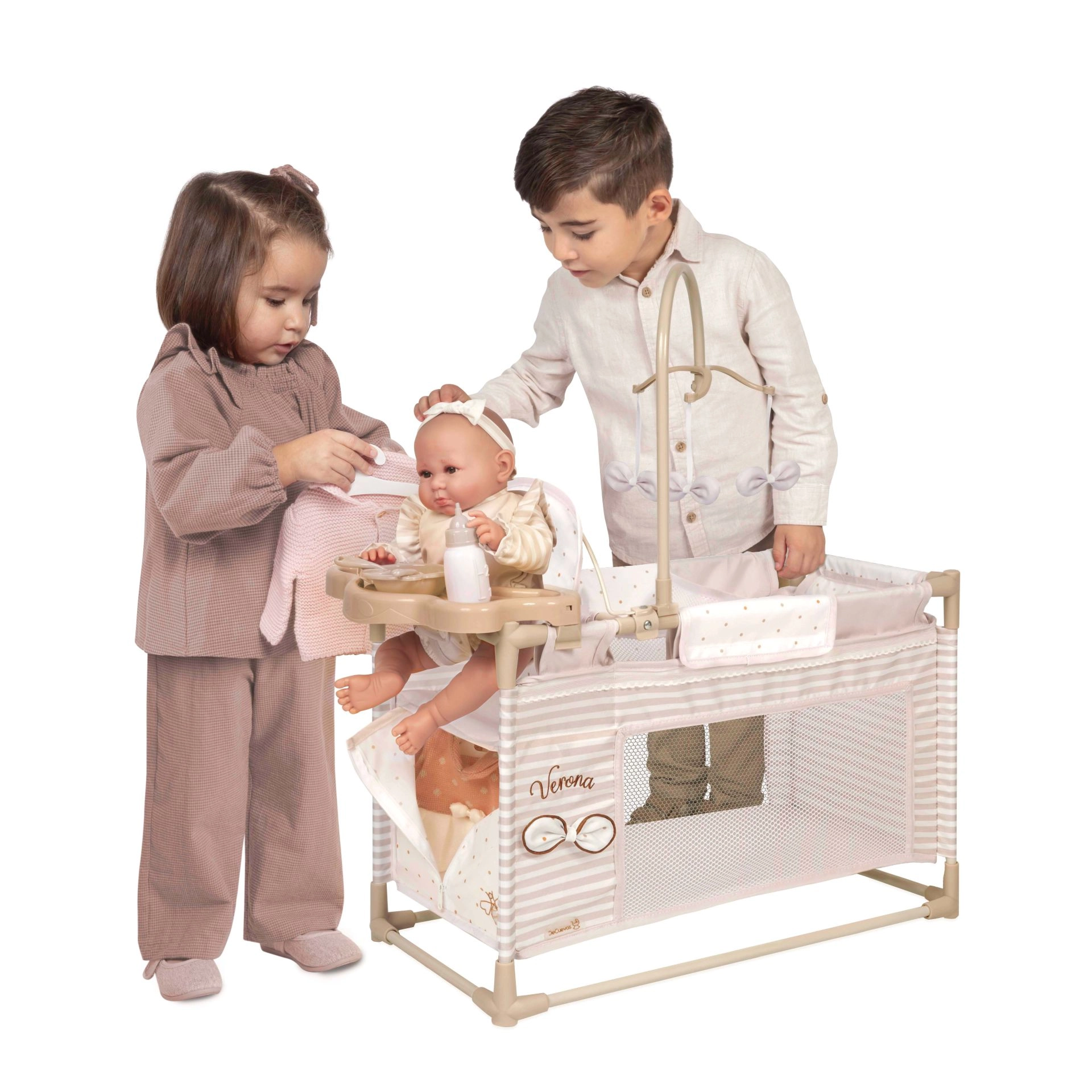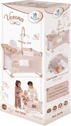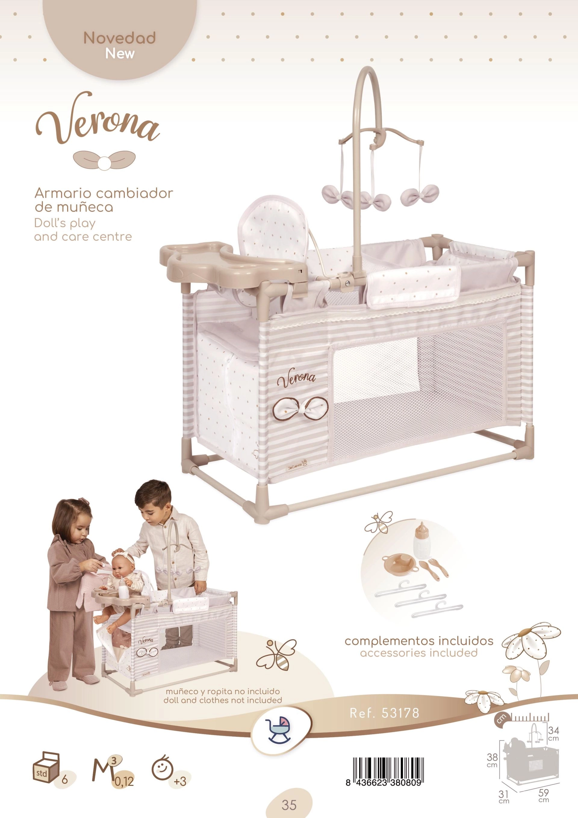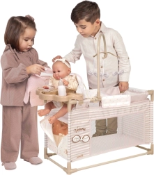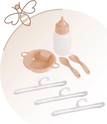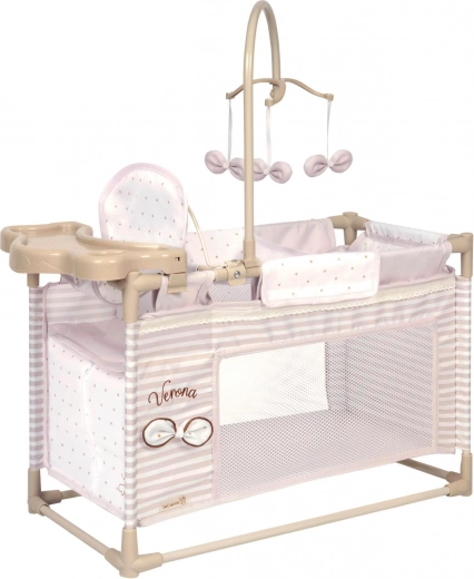 В комплекта е включено всичко, от което малките майки се нуждаят: въртележка за забавление на куклата, плот за повиване за грижа, столче за хранене с шише, купичка и прибори и практичен гардероб с цип и закачалки. Спалната част с мрежест прозорец позволява на децата да виждат куклата, а просторната основа осигурява комфорт при игра.