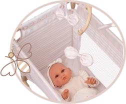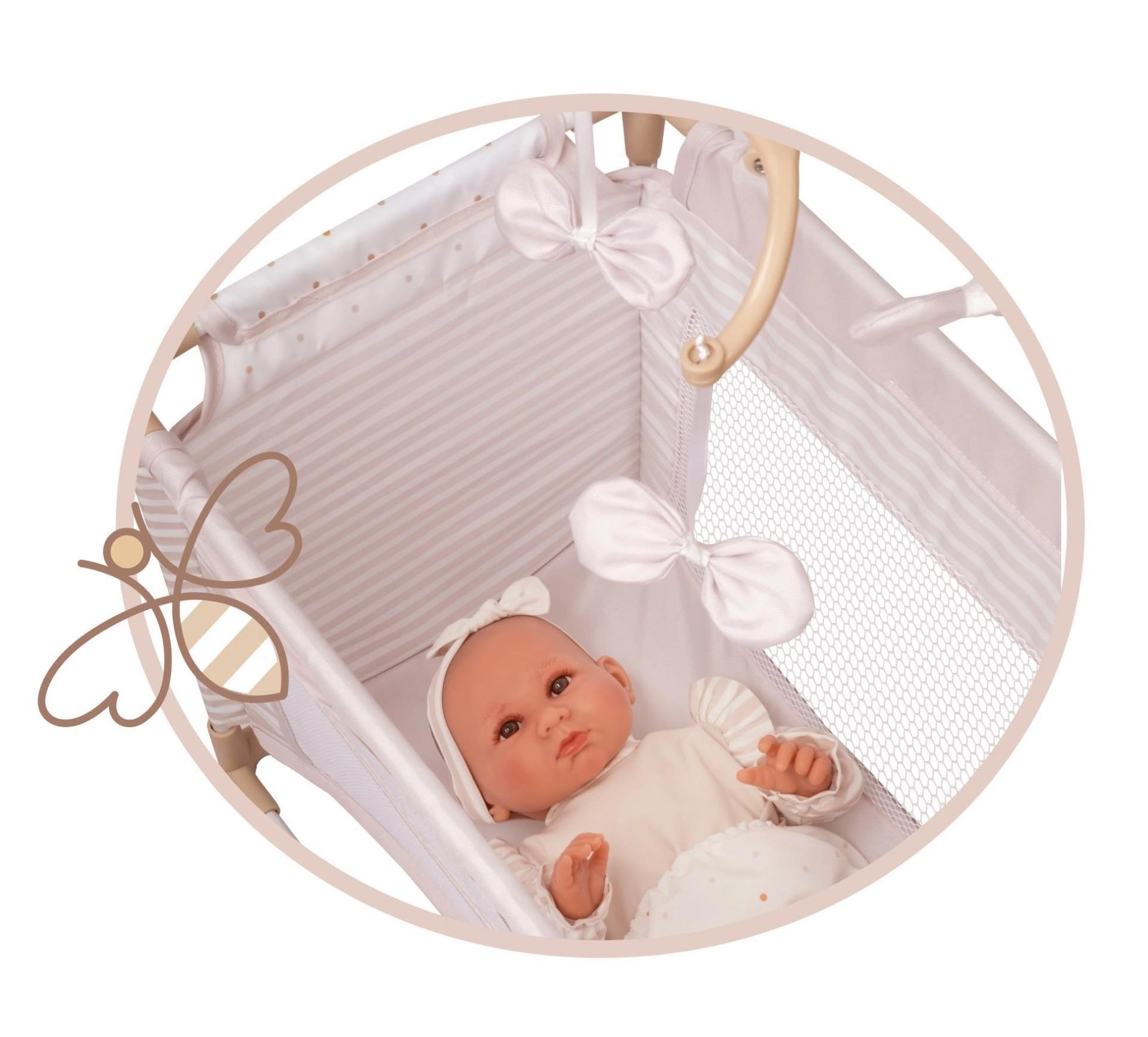 Това елегантно легълце за кукли в пастелни бежови и бели тонове стилно допълва всяка детска стая. Комбинира естествена визия с очарователни детайли като точки, райета и деликатни панделки, напомнящи венчелистчета. Благодарение на качествената изработка и стабилната конструкция играта е безопасна и удобна.