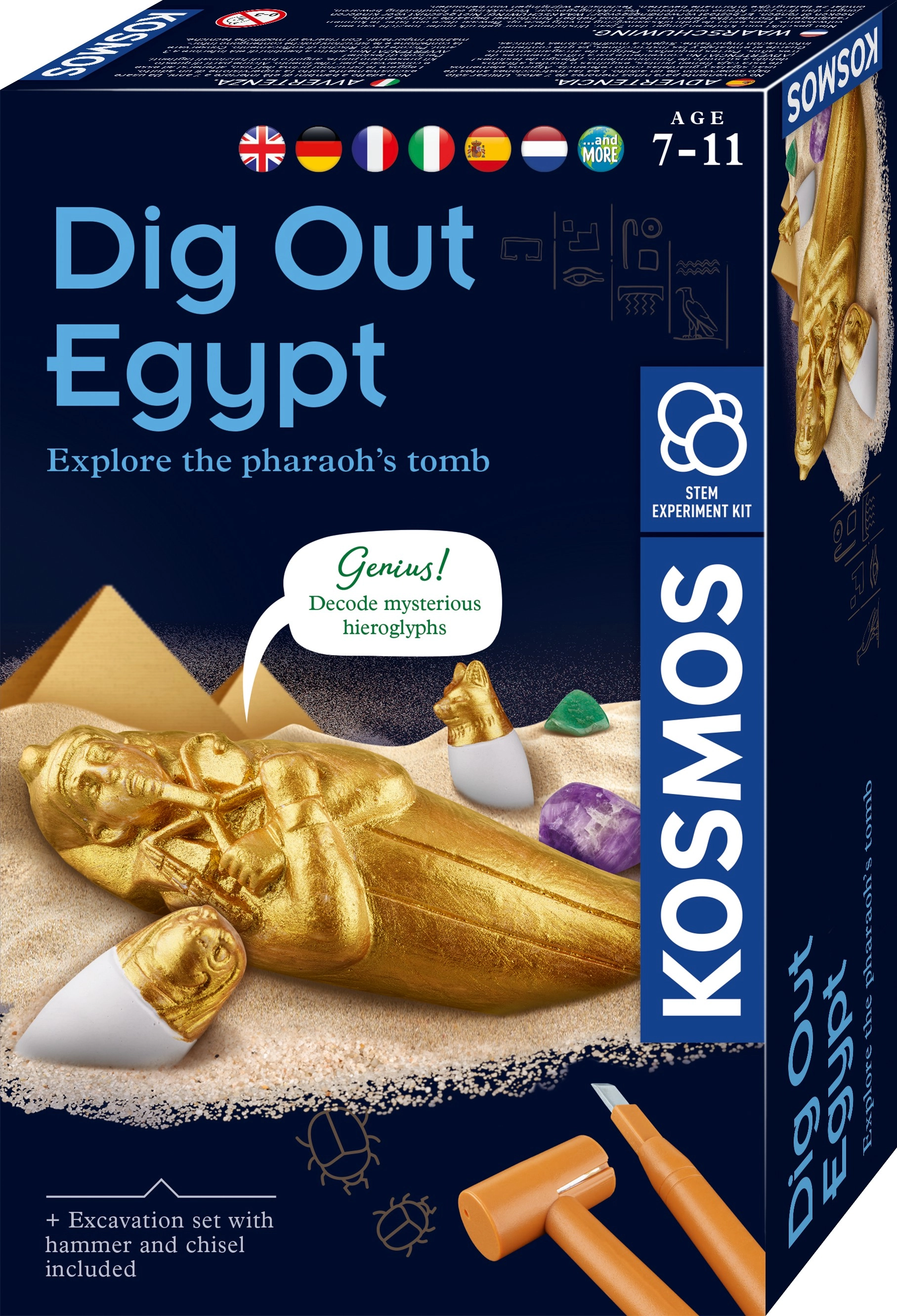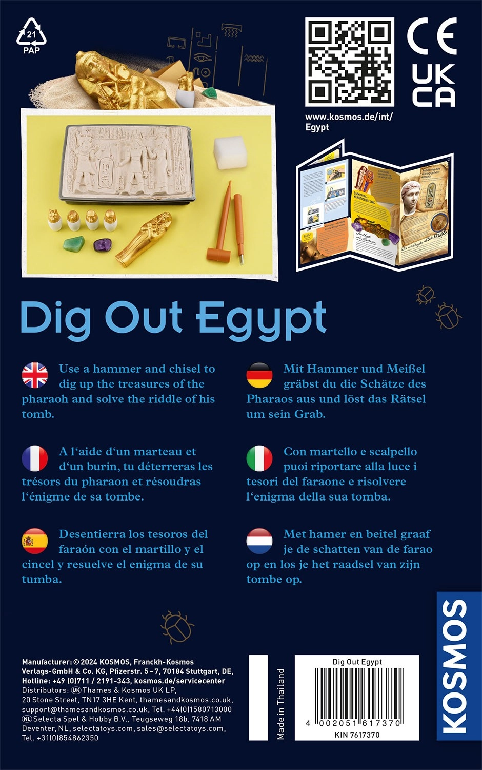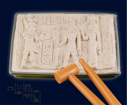 С археологическия комплект Kosmos египетски разкопки вашите деца ще се превърнат в малки археолози. С помощта на длето и чук те стъпка по стъпка ще откриват съкровищата, скрити в гипса, като същевременно ще научат много любопитни факти за Древен Египет. Практичното илюстрирано ръководство е налично на английски с български превод, а българската инструкция лесно се изтегля чрез QR код.