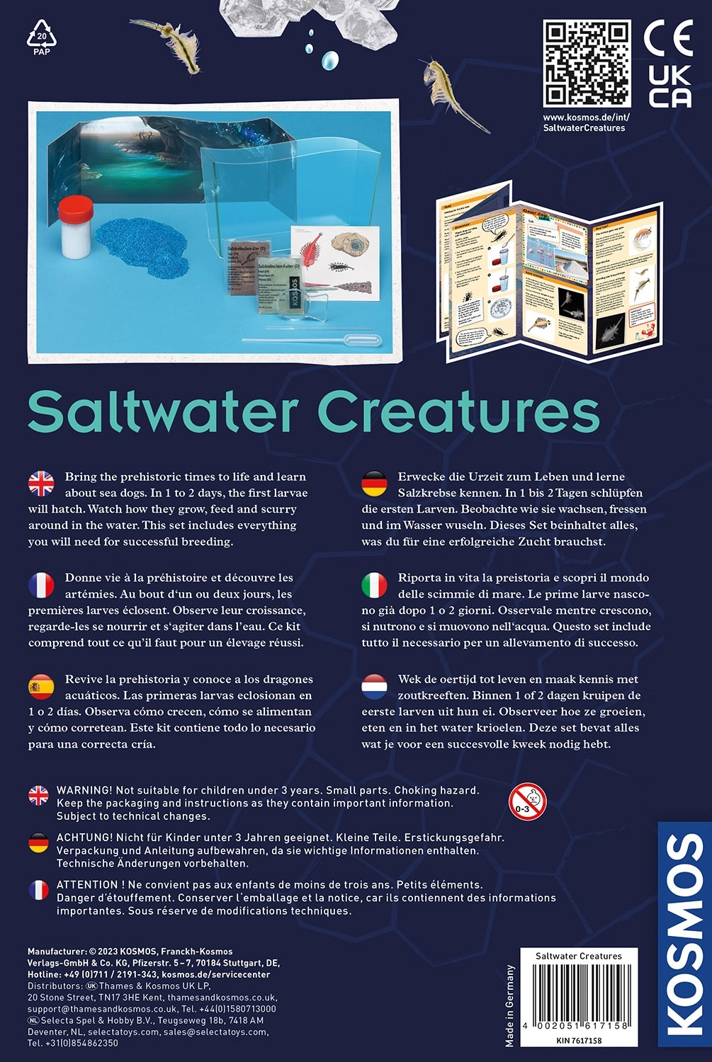 Открийте завладяващия свят на малките водни създания с образователния комплект Kosmos за отглеждане на салинна артемия (Artemia). Комплектът съдържа всичко необходимо за лесен старт: резервоар, специална сол, храна, яйца и инструкции на български за изтегляне чрез QR код. Идеален подарък за деца 8–12 години, който насърчава опознаването на природата и науката.