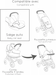 Столчето е съвместимо с избрани шасита на детски колички (шасито не е част от комплекта), което прави играта на родители още по-забавна. Пространството за съхранение на задната страна побира дребни аксесоари, биберон или шишенце. Подходящо за кукли до размер 42 cm.