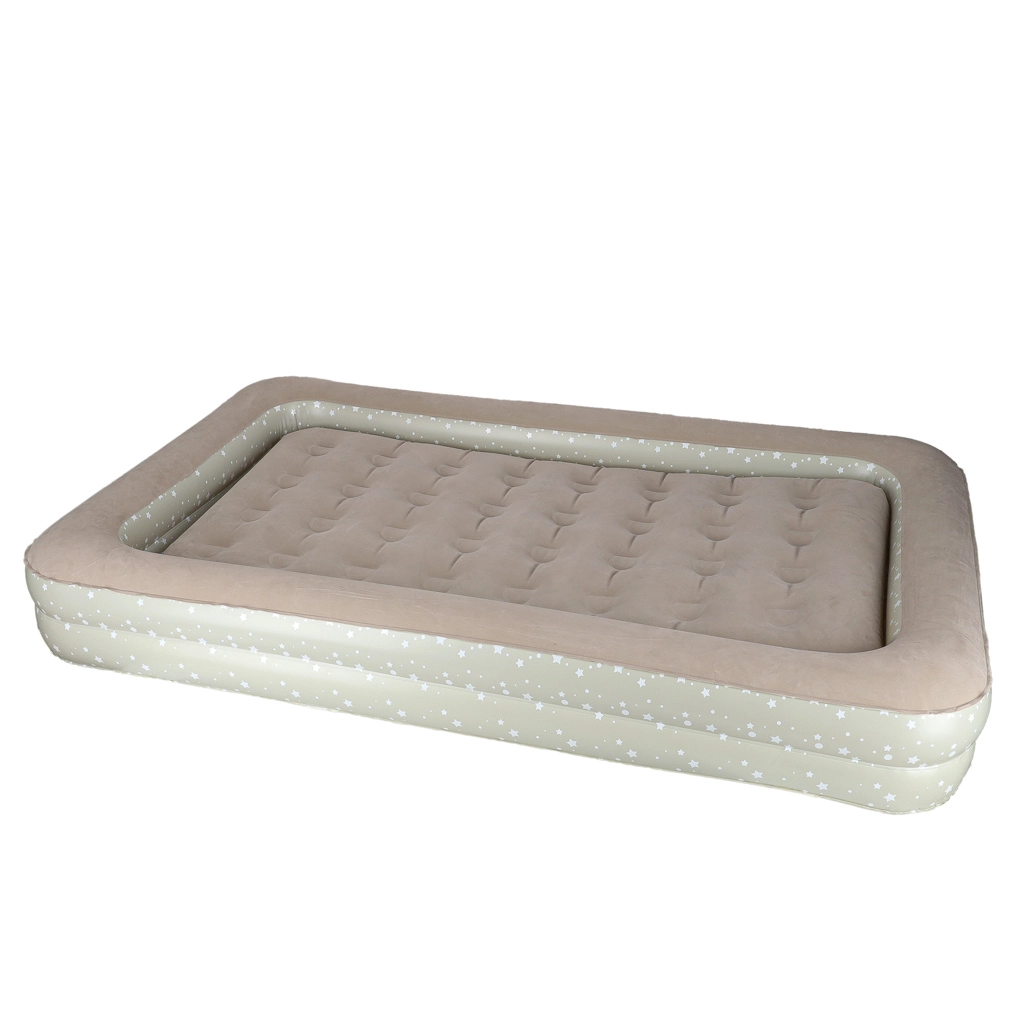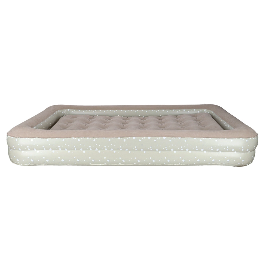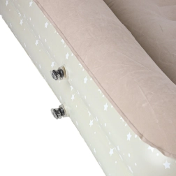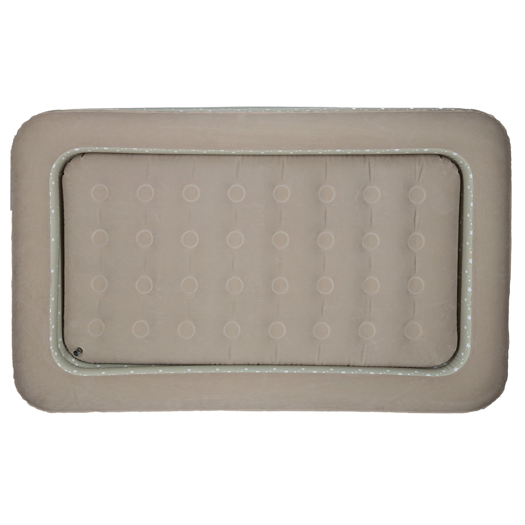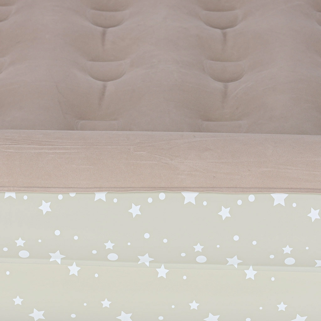 Създайте на децата удобно и безопасно място навсякъде – това двукомпонентно детско надуваемо легло комбинира външна рамка с повдигнати ръбове и подвижен вътрешен матрак. Меката флокирана (велурена) повърхност е приятна на допир и предотвратява плъзгането на спалното бельо. Елегантният звезден мотив придава игрив вид на леглото.