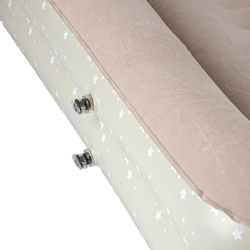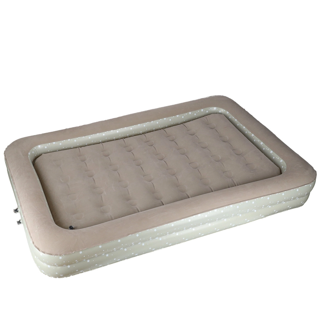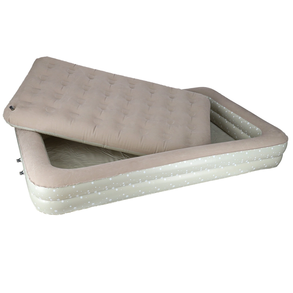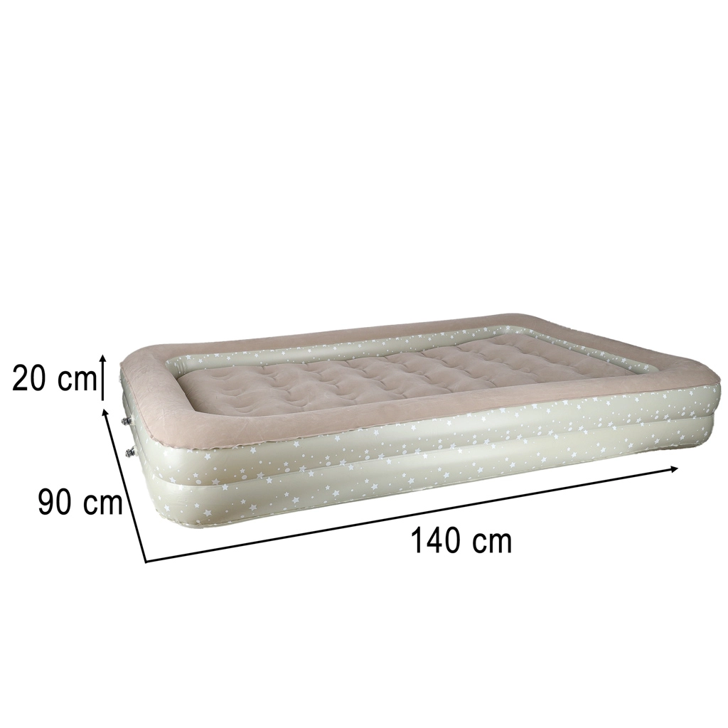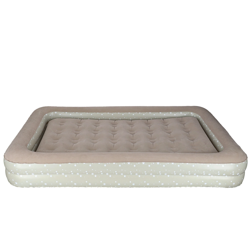 Създайте на децата удобно и безопасно място навсякъде – това двукомпонентно детско надуваемо легло комбинира външна рамка с повдигнати ръбове и подвижен вътрешен матрак. Меката флокирана (велурена) повърхност е приятна на допир и предотвратява плъзгането на спалното бельо. Елегантният звезден мотив придава игрив вид на леглото.