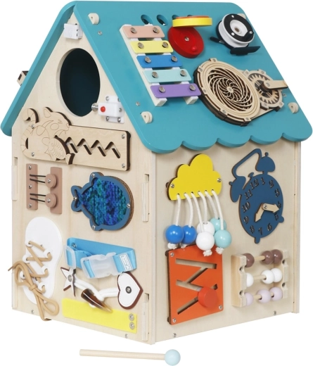 Тази висококачествена дървена активити дъска във форма на къщичка е вдъхновена от принципите на Монтесори и мотивира децата към самостоятелно откриване. Всяка страна носи нови стимули – от реални ключалки и кукички, през въртящ се таймер, до цветен лабиринт с рибка. Вътре къщичката свети, а функционалният ключ за лампата усилва сетивното изживяване. Свирещият телефон забавлява с мелодии и звуци, а ксилофонът с палка развива ритъма и слуха.