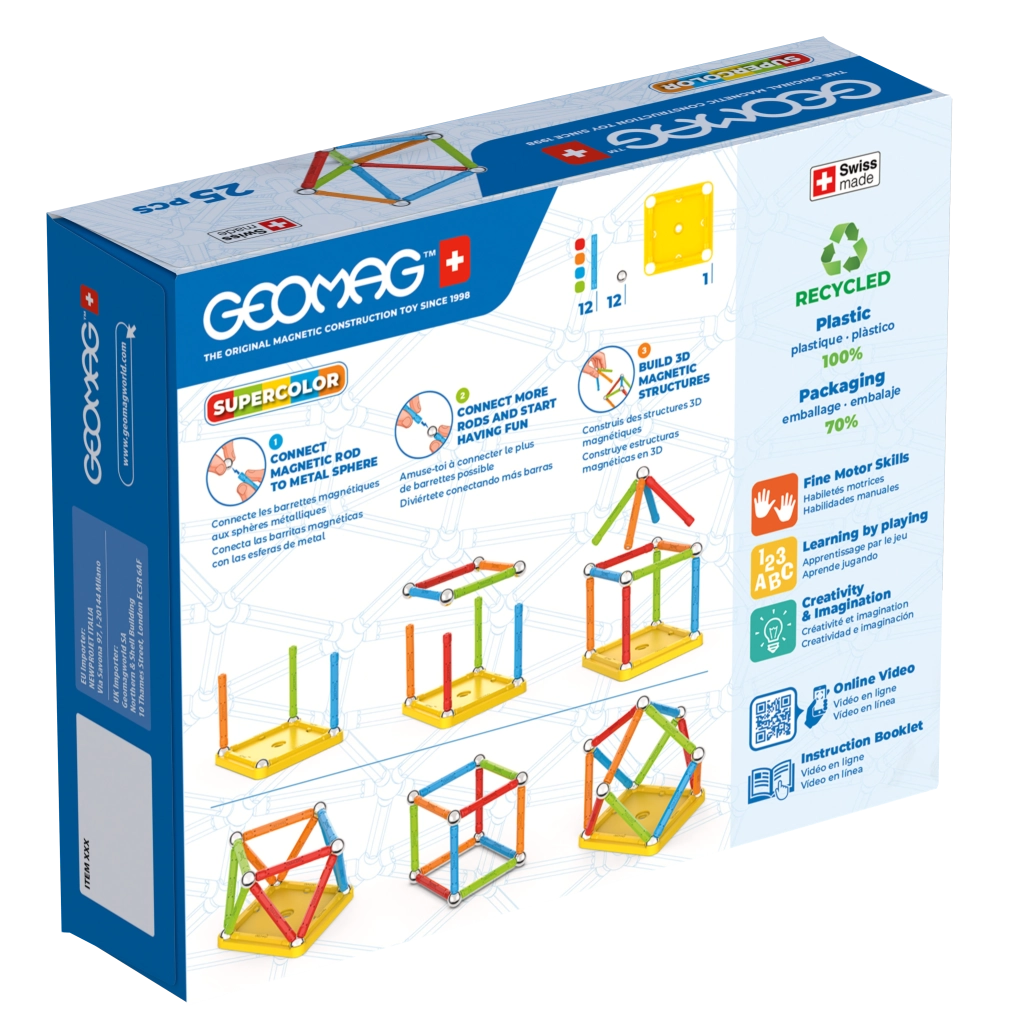 Конструкторът GEOMAG Supercolor развива детското въображение, логика и фина моторика. Благодарение на магнитните свръзки децата лесно създават различни форми, кули и базови геометрични конструкции. Ярките цветове и здравите стоманени топчета осигуряват лесно свързване и стабилност.