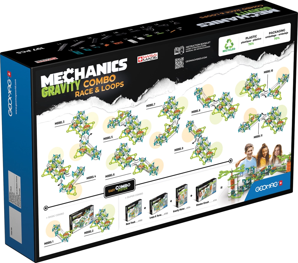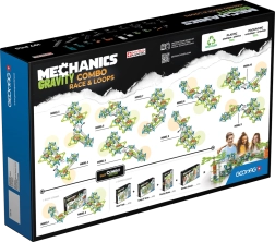 GEOMAG Mechanics Gravity Combo е умна писта с топчета, в която основна роля играят гравитацията и магнетизмът. Сглобявайте разнообразни трасета, следете движението на стоманените топчета и експериментирайте с предавки, спусъци и насочване на потока от топчета. Всяко пренареждане носи нови предизвикателства и радост от откривателството.