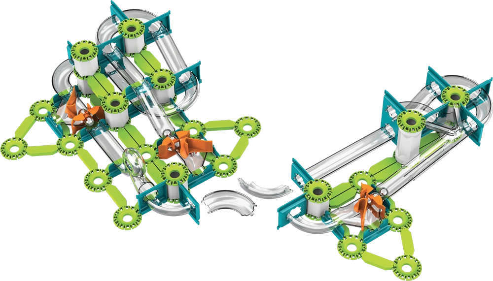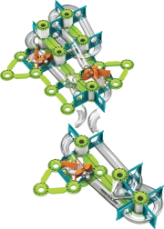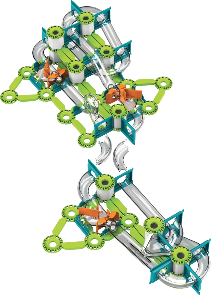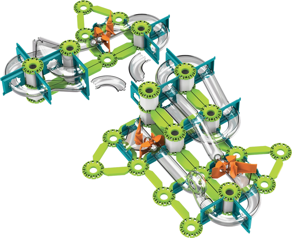 Зелените писти, носещите елементи и оранжевите спусъци лесно се свързват в стабилни трасета. Интерактивните елементи водят топчетата през завои и падове.
