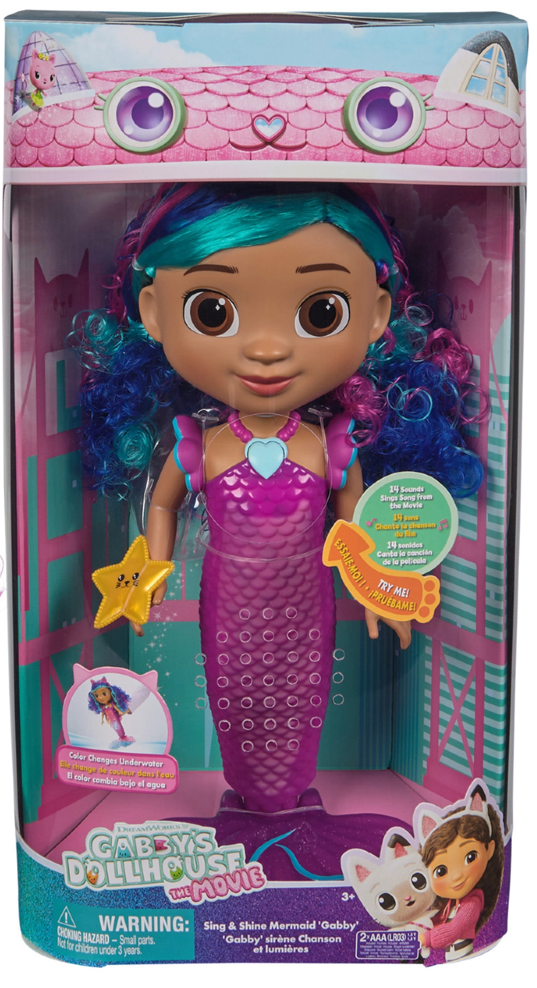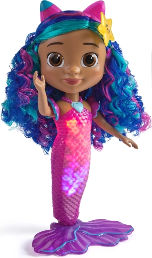 Морската фея Габи от филма „Вълшебната къща на Габи“ носи на децата съчетание от светлини, звуци и водни ефекти. Натиснете сърцевидното колие и се насладете на светлинни ефекти и 14 автентични звука и фрази. Опашката на куклата допълнително променя цвета си в топла вода, така че всяка вана или водна игра е пълна с изненади.
