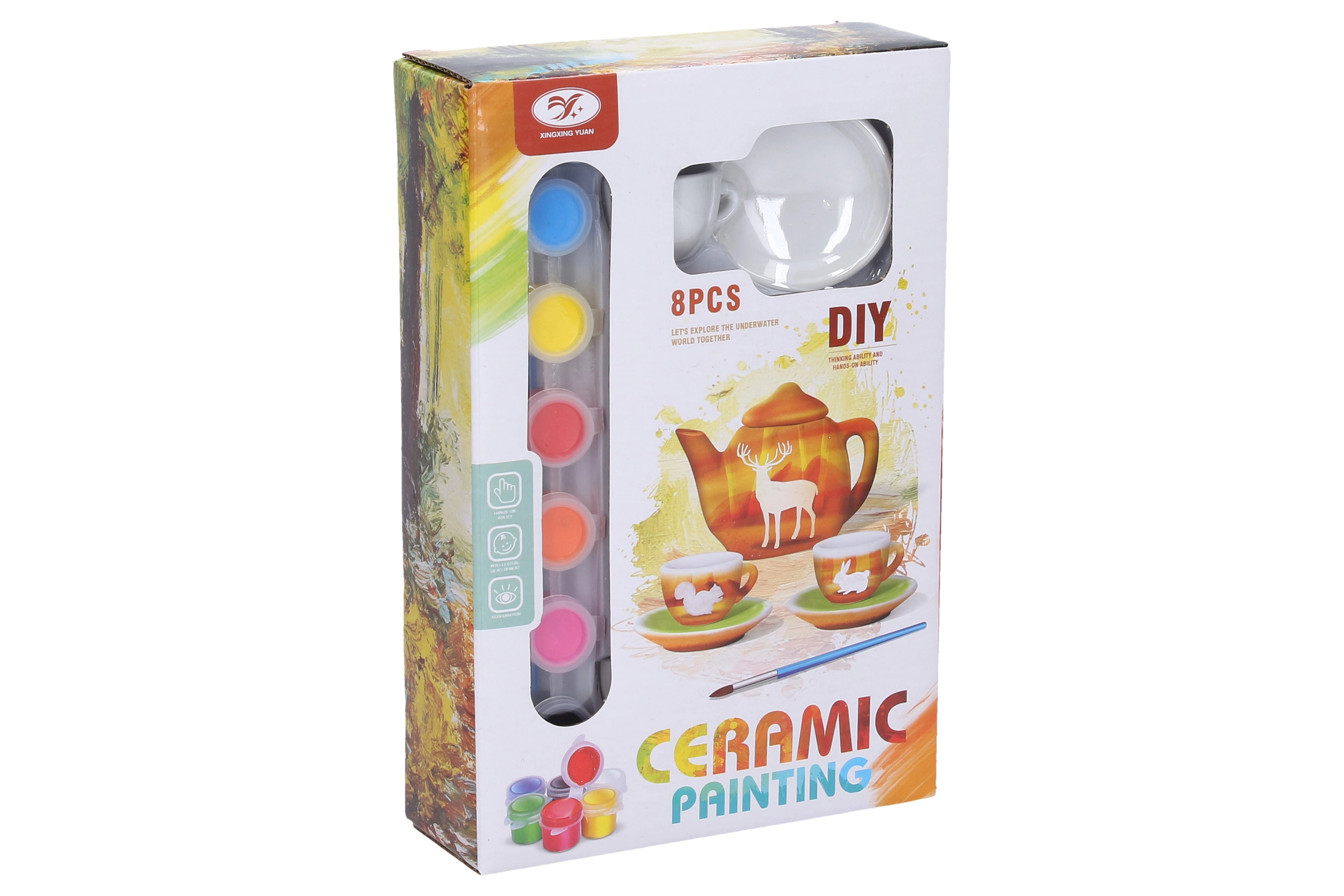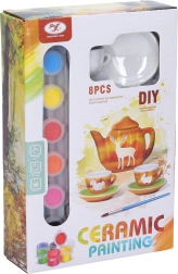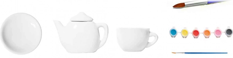- Пълно съдържание: каничка с капаче, 2 чашки, 2 чинийки, 6 бои, четка