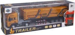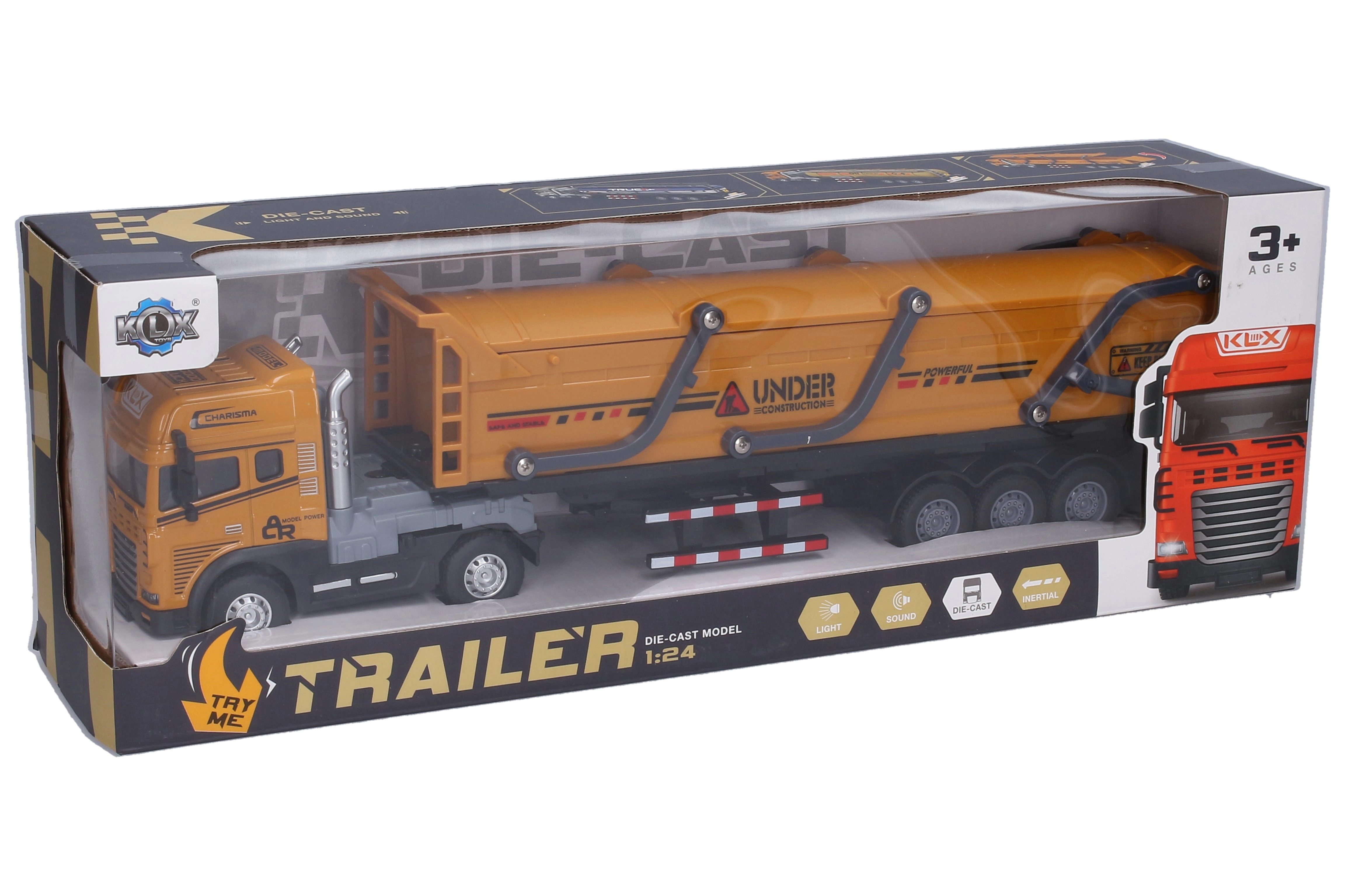 Здрав метален влекач със самосвално ремарке ще зарадва малките шофьори с реалистична изработка и функции. Предлага инерционен механизъм за плавно движение, светлинни и звукови ефекти с активиране чрез движение на предните колела, както и практичeн лост за заключване на ремаркето. Ремаркето може лесно да се откачи. Батерии 3× AG13 са включени в комплекта.