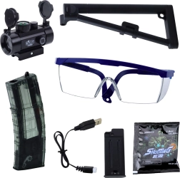 - гел пистолет MK7, акумулатор 7,4 V Li, USB кабел, 2 пълнителя, оптичен мерник, защитни очила, тактически приклад, пакет гелови топчета за накисване, оригинална кутия