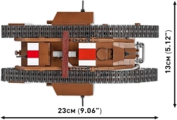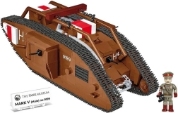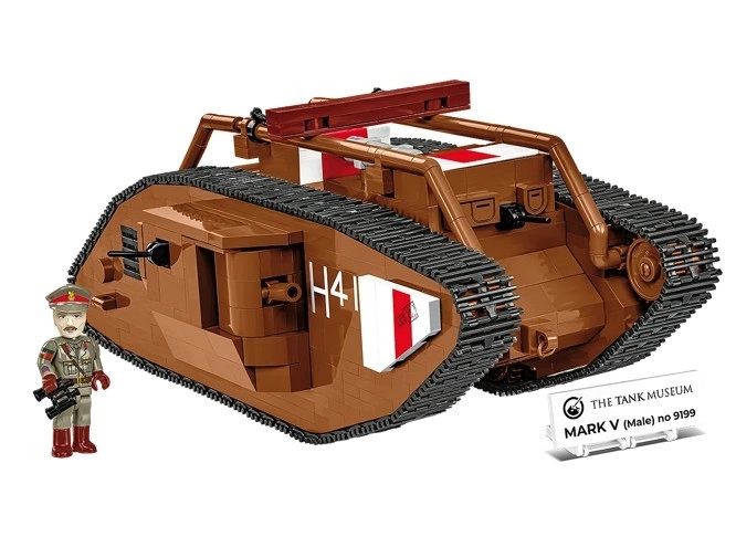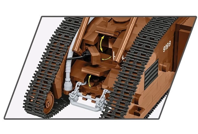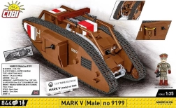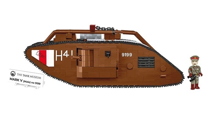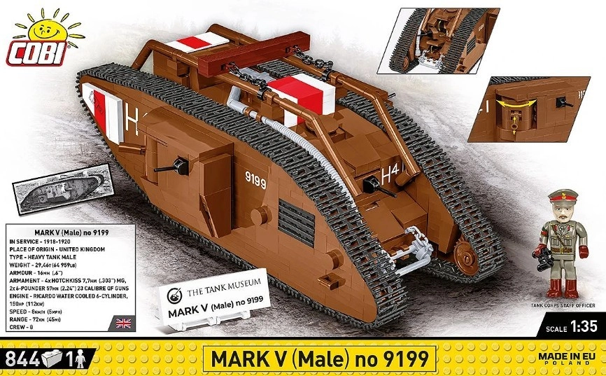 Този прецизно изработен модел на легендарния британски танк MARK V (Male) е базиран на автентичния музейен екземпляр № 9199 от The Tank Museum в Бовингтън. Благодарение на мащаба 1:35 отлично подхожда на фигурките и другите модели COBI. Трайните печати без стикери, функционалното веригово задвижване и детайлната изработка го правят атрактивно попълнение за всяка колекция.