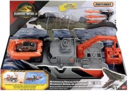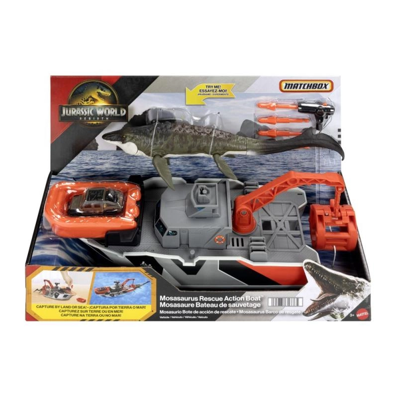 Потеглете на приключенска мисия с тази спасителна лодка Matchbox от колекцията Юрски свят. Корабът с дължина 32 см плава по вода и се движи по суша, предлага функционална лебедка за транспортиране на включения мозазавър (33 см), изстрелващи се харпуни за екшън лов на ДНК и отделящ се спасителен сал с метален Jeep 1:64. Страхотна играчка за любителите на динозаври и екшън мисии.