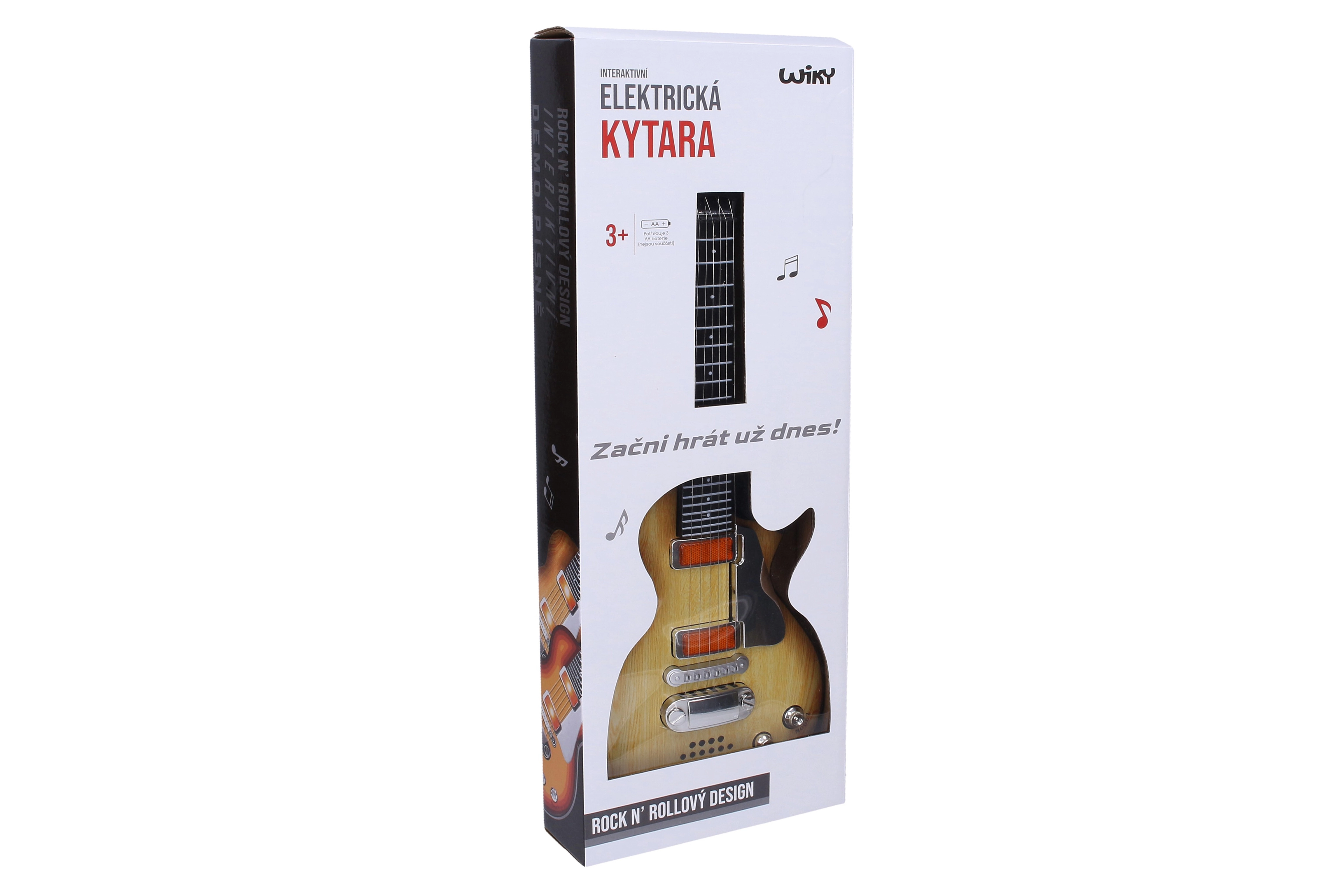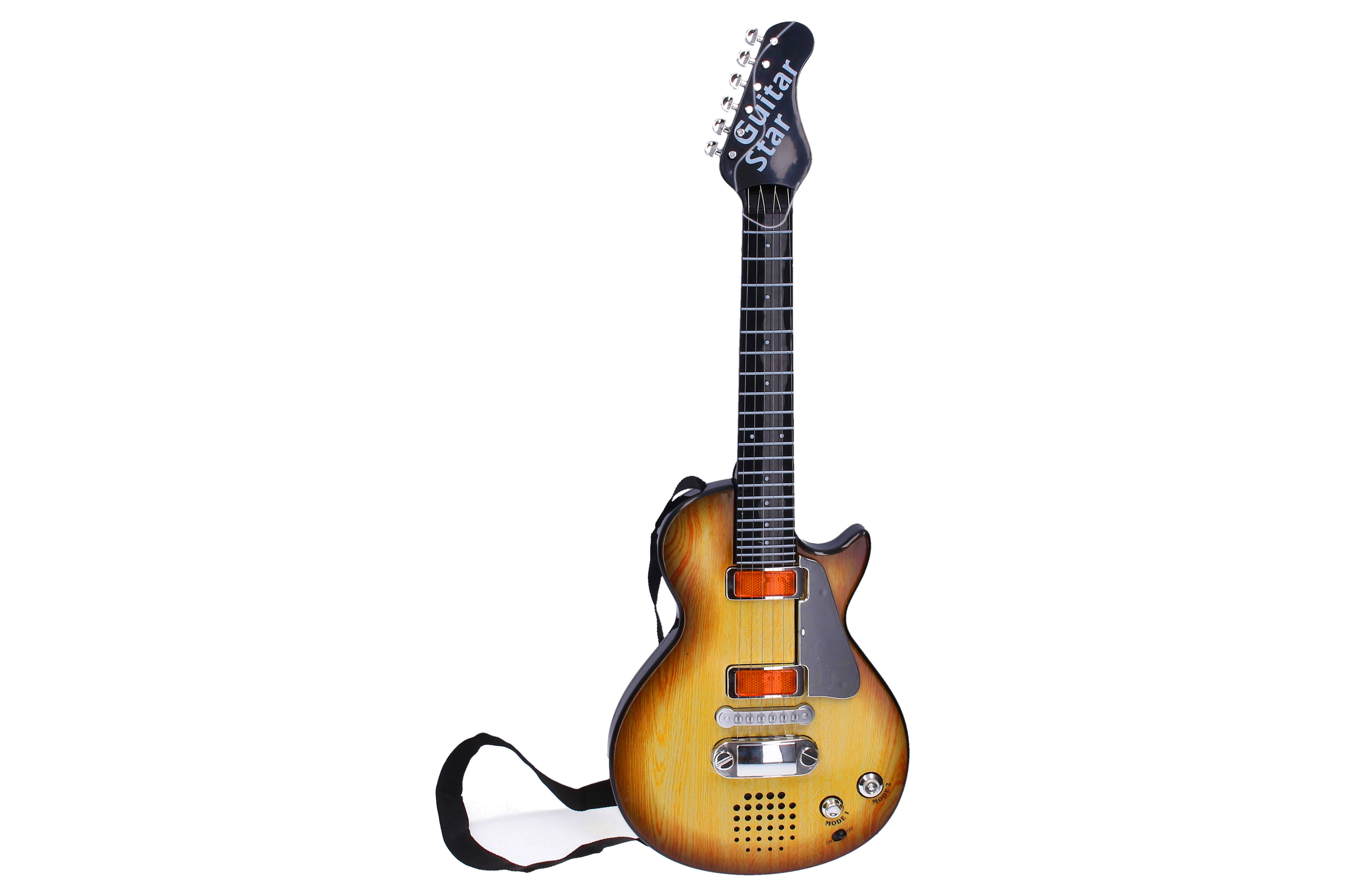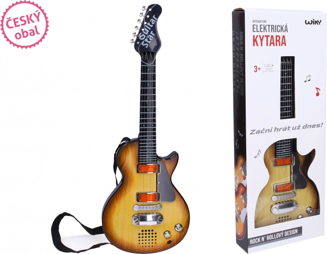 Открийте забавната електрическа детска китара с ефекти с дължина 55 см, идеална за малки музиканти. Предлага атрактивни светлинни и звукови ефекти, лесно управление и чешка опаковка за удобно използване. Микрофонът не е включен, а за работа са необходими 3× AA батерии (не са включени).