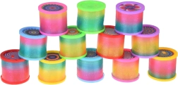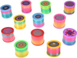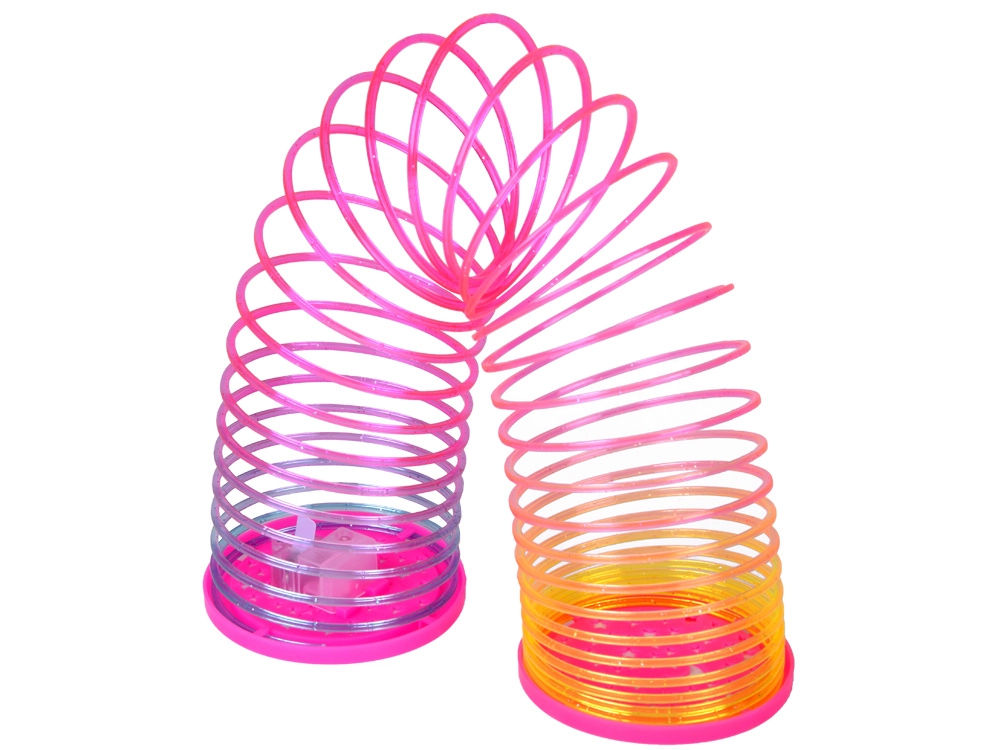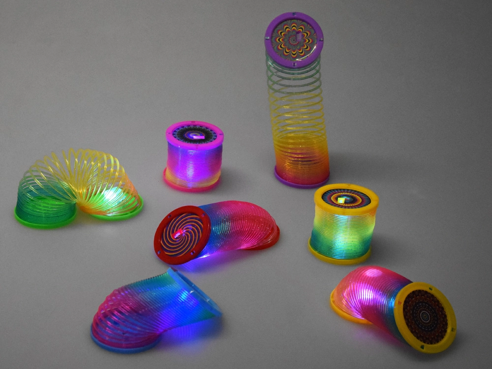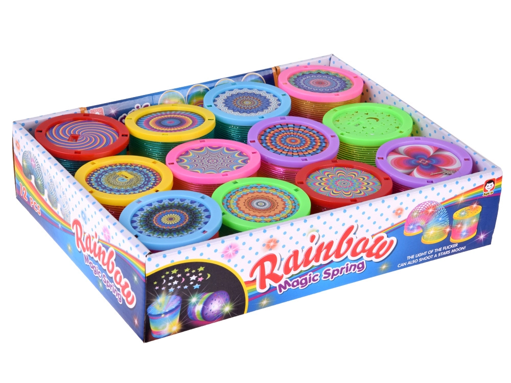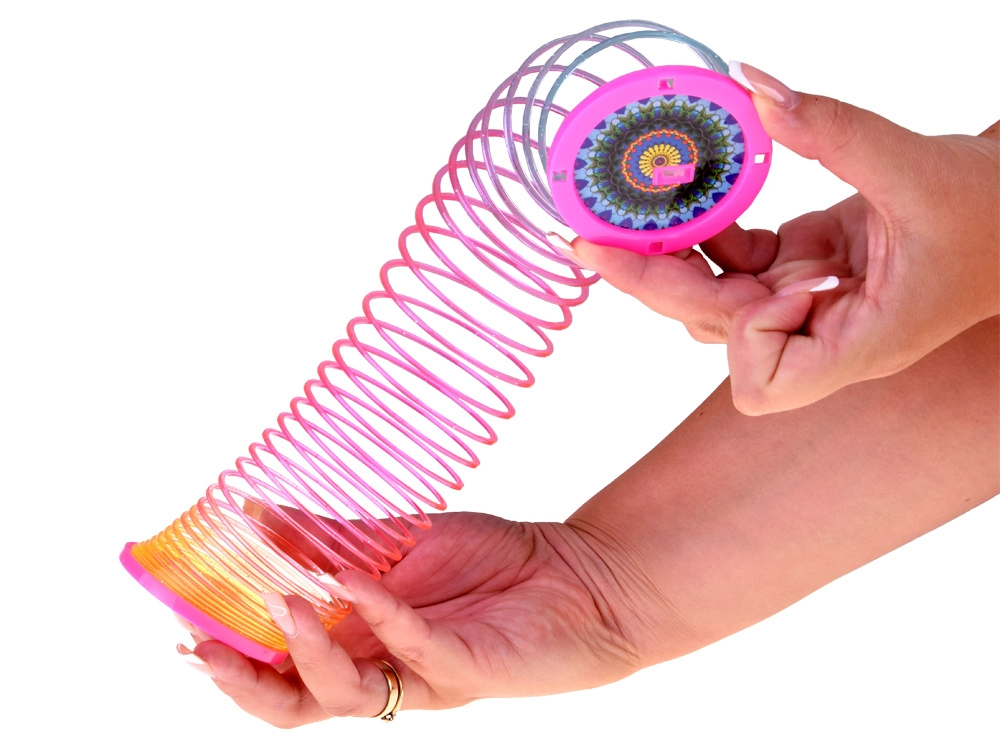 Популярната дъгова пружинка се завръща в светеща версия, която впечатлява деца и възрастни. След активиране LED диодите сменят цветовете в различни ритми, а след сваляне на защитната лепенка се превръща в проектор на звезди – изобразява цветни звезди и луна върху стената. Страхотна за игра по стълбите, лесни трикове и релакс.