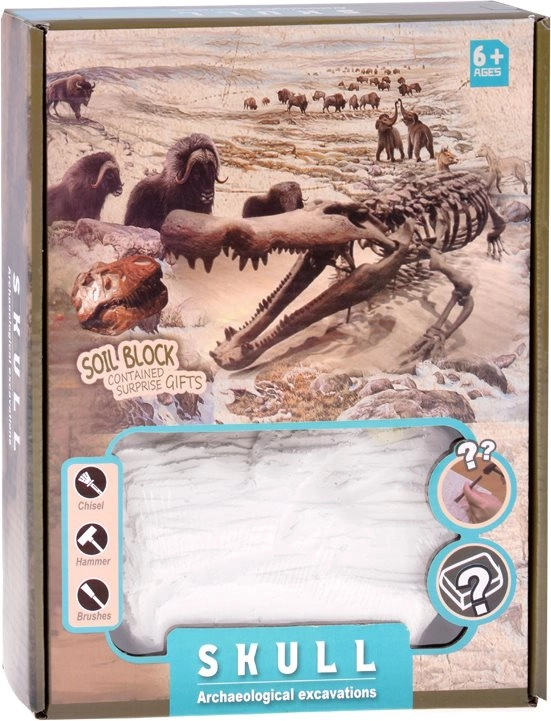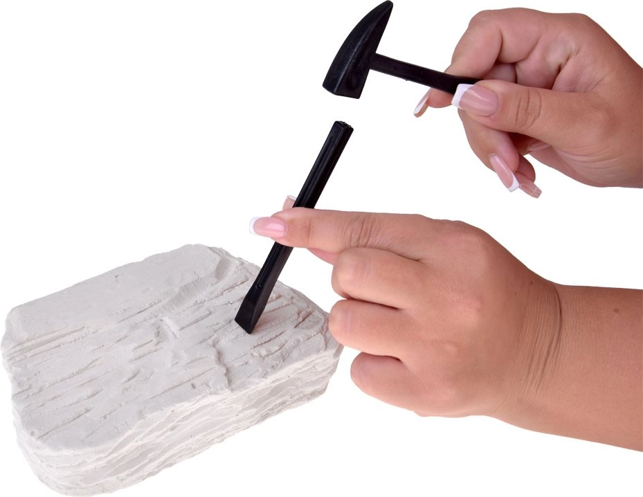 Във всеки блок има изненада – може да бъде череп на мамут, саблезъб тигър, орел, крокодил и други завладяващи създания. С чукче, длета и четка децата ще изпробват работата на млад археолог и стъпка по стъпка ще открият скритата находка.