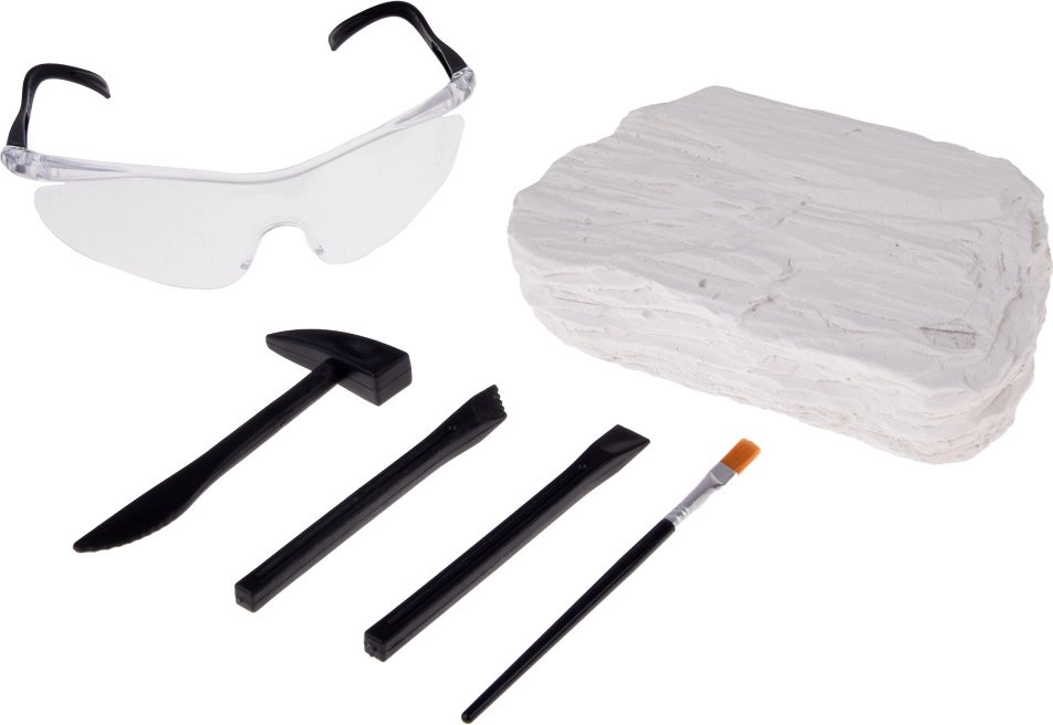 В комплектa има здрав гипсов блок и предпазни очила, които защитават очите при разкриване на фосили. Идеален за безопасна домашна археология.